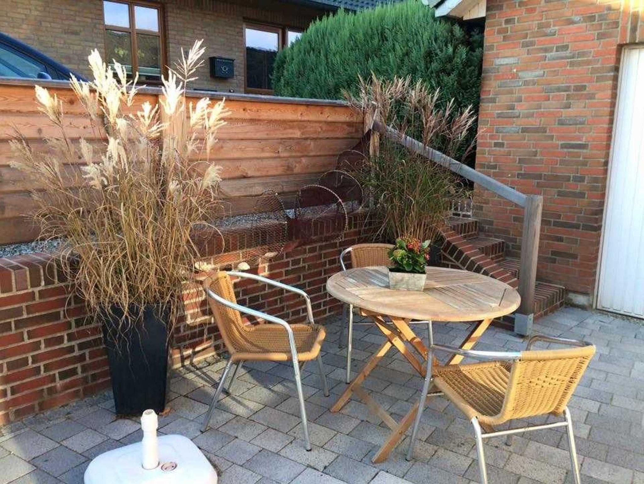 Ein geschützter Garten mit Strandkorb, Gartenliegen und Sitzmöbeln lädt zum Entspannen, Sonnenbaden und Grillen ein.