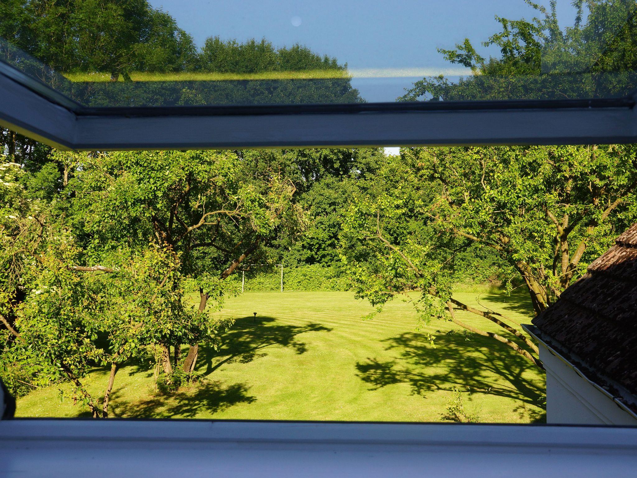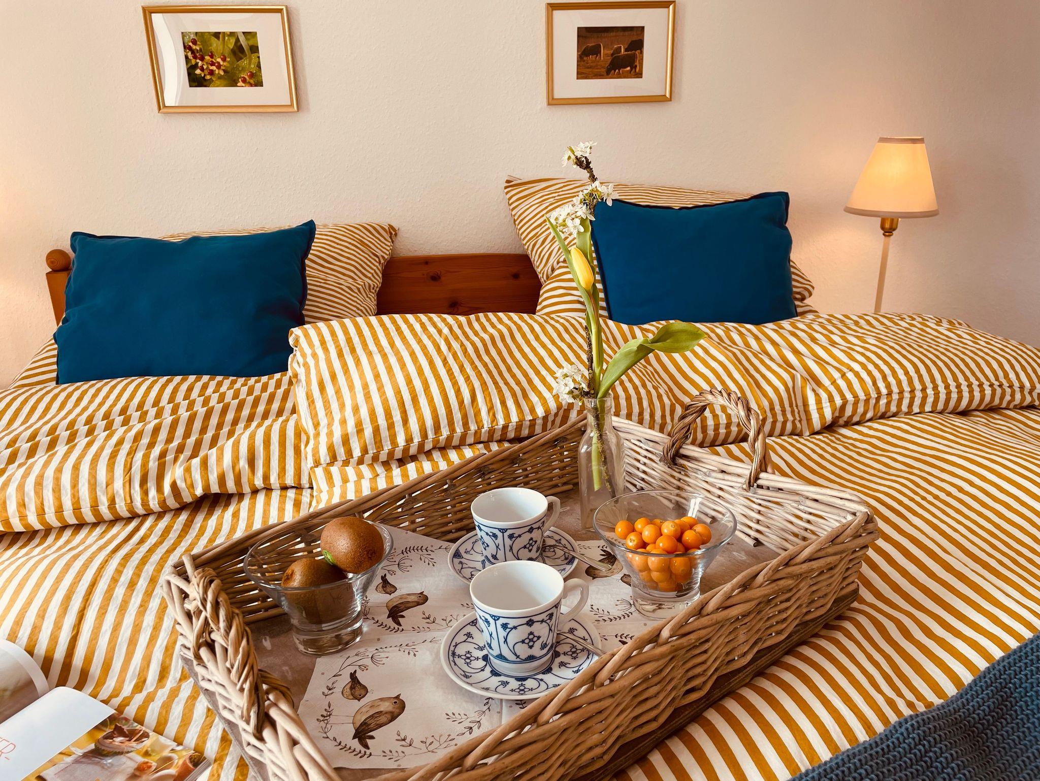 Die Einrichtung ist in einem klaren Stil gehalten, der durch antike Landhausmöbel akzentuiert wird. Die Räume sind hell, die Sonne begrüßt einen zum Frühstück und schaut zum Abend nochmal in die Schlafräume. Zudem bietet die Wohnung einen schönen, weiten Blick in den großen Garten.