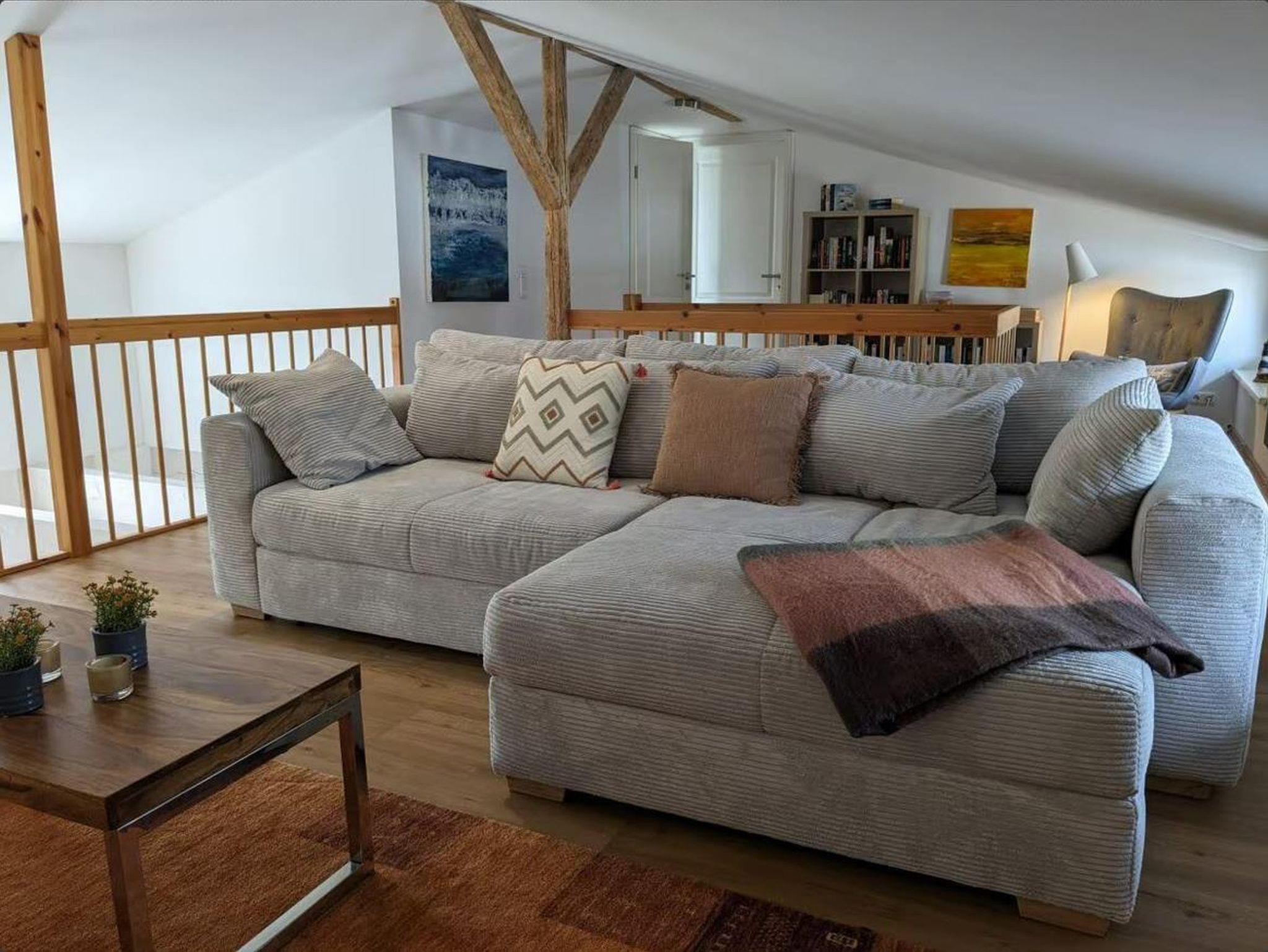 • großer, offener Wohnbereich auf der Galerie mit Schlafsofa und Leseecke
