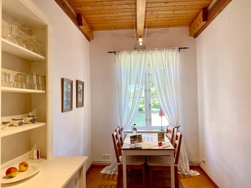 Die "Bauernstube" befindet sich im Haupthaus des Dreiseithofes. Sie wohnen also unter Reet. Über die dazugehörige Terrasse gelangen Sie barrierefrei in das Wohnzimmer und anschließend in die Küche mit Essplatz. In der kleinen Küchenzeile finden Sie vom Wasserkocher über Geschirrspülmaschine bis hin zur Mikrowelle mit Backfunktion u.a. alles, was man für einen angenehmen Urlaub so braucht.