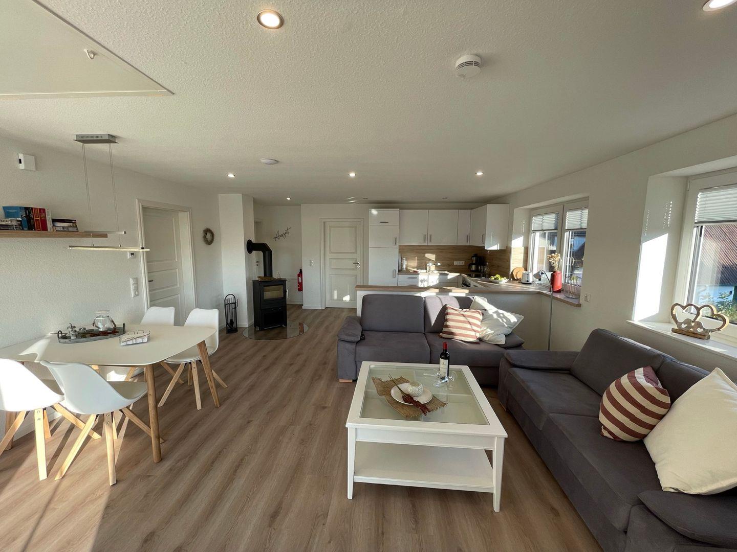 Die vollausgestattete Ferienwohnung "Stuuv dree" im 1. OG hat eine Größe von 90m² und ist für bis zu 4 Personen geeignet. Die offene Küche bietet eine hochwertige Ausstattung und geht in das Ess- und Wohnzimmer mit Kamin und Balkon über. Das Duschbad und die Sauna bieten Erholung. Zusätzlicher Komfort ist durch einen PKW-Stellplatz mit E-Ladesäule direkt am Haus gewährleistet. Im abschließbaren Fahrradschuppen können Sie Ihre Fahrräder unterstellen.
