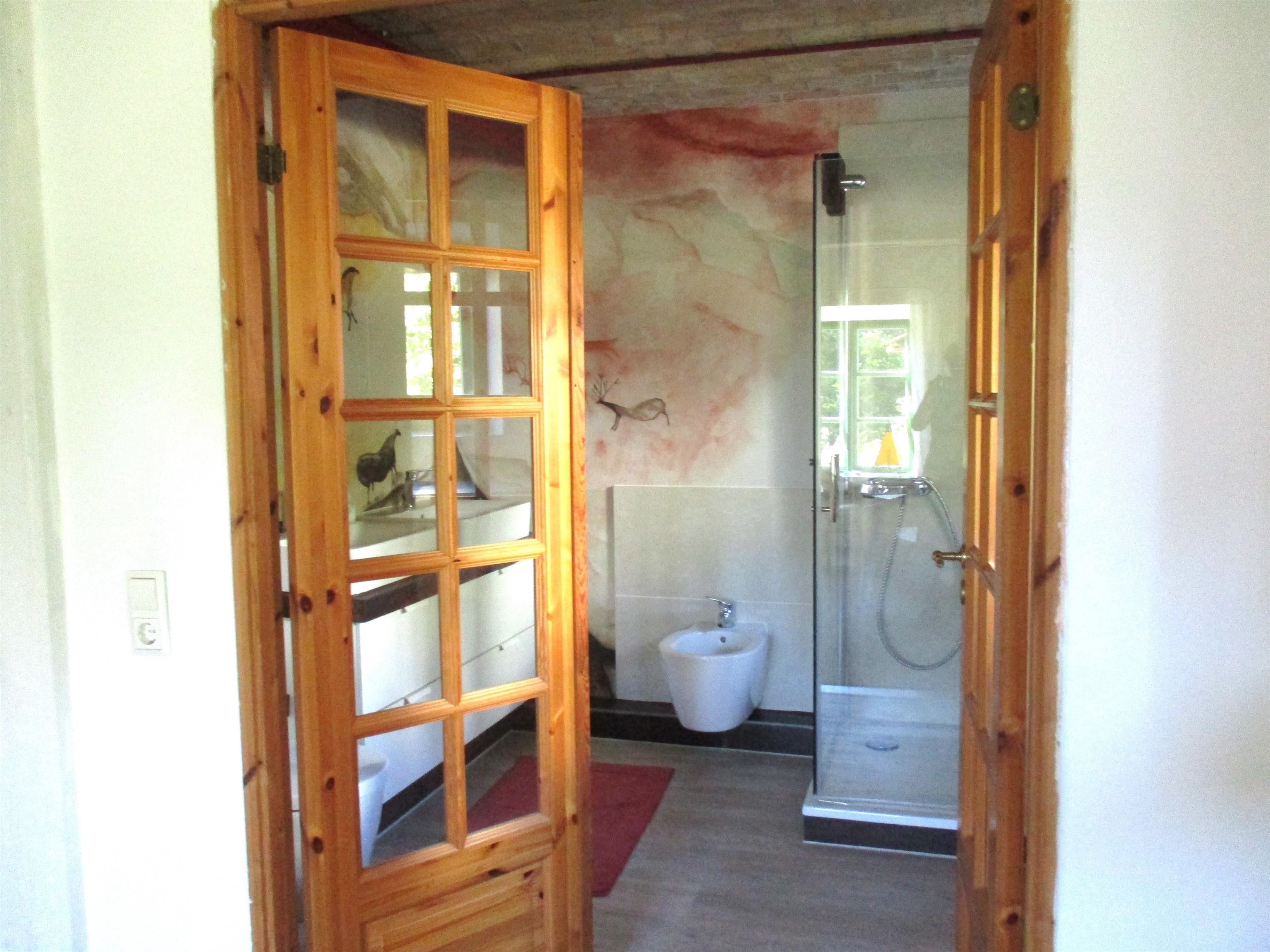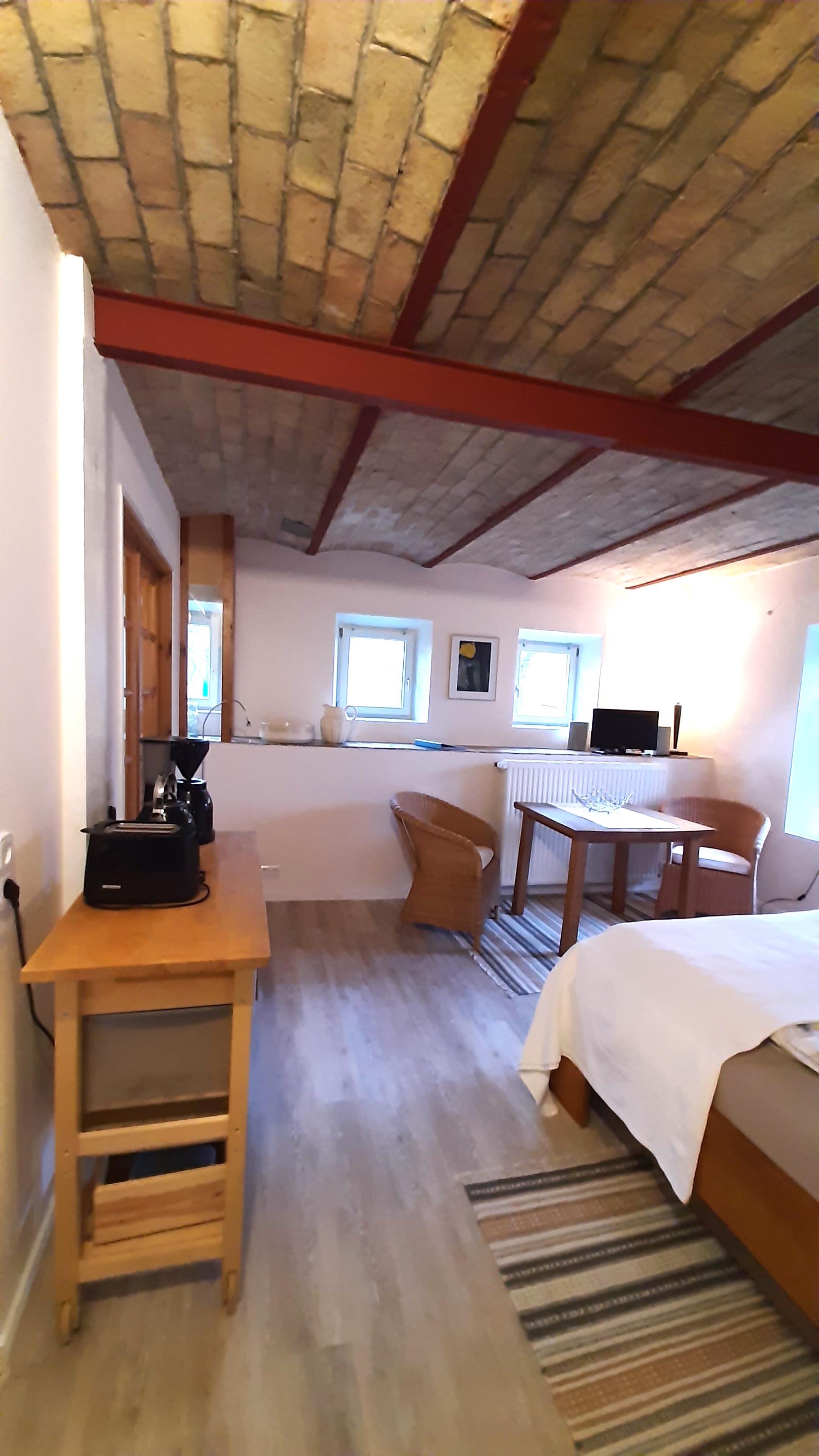 Die Wohnung ist 30m2 groß und liegt im alten Pferdestall. Die gut erhaltene Backstein-Kappendecke sorgt für ein rustikales Ambiente, außerdem gibt eine Wandmalerei im Bad der Wohnung eine unverwechselbare Prägung. Vorm Fenster befindet sich ein Staudengarten mit Rasenfläche und Obstbäumen und ein Garten- oder Teehäuschen, das den Gästen dieser Ferienwohnung zur Verfügung steht.