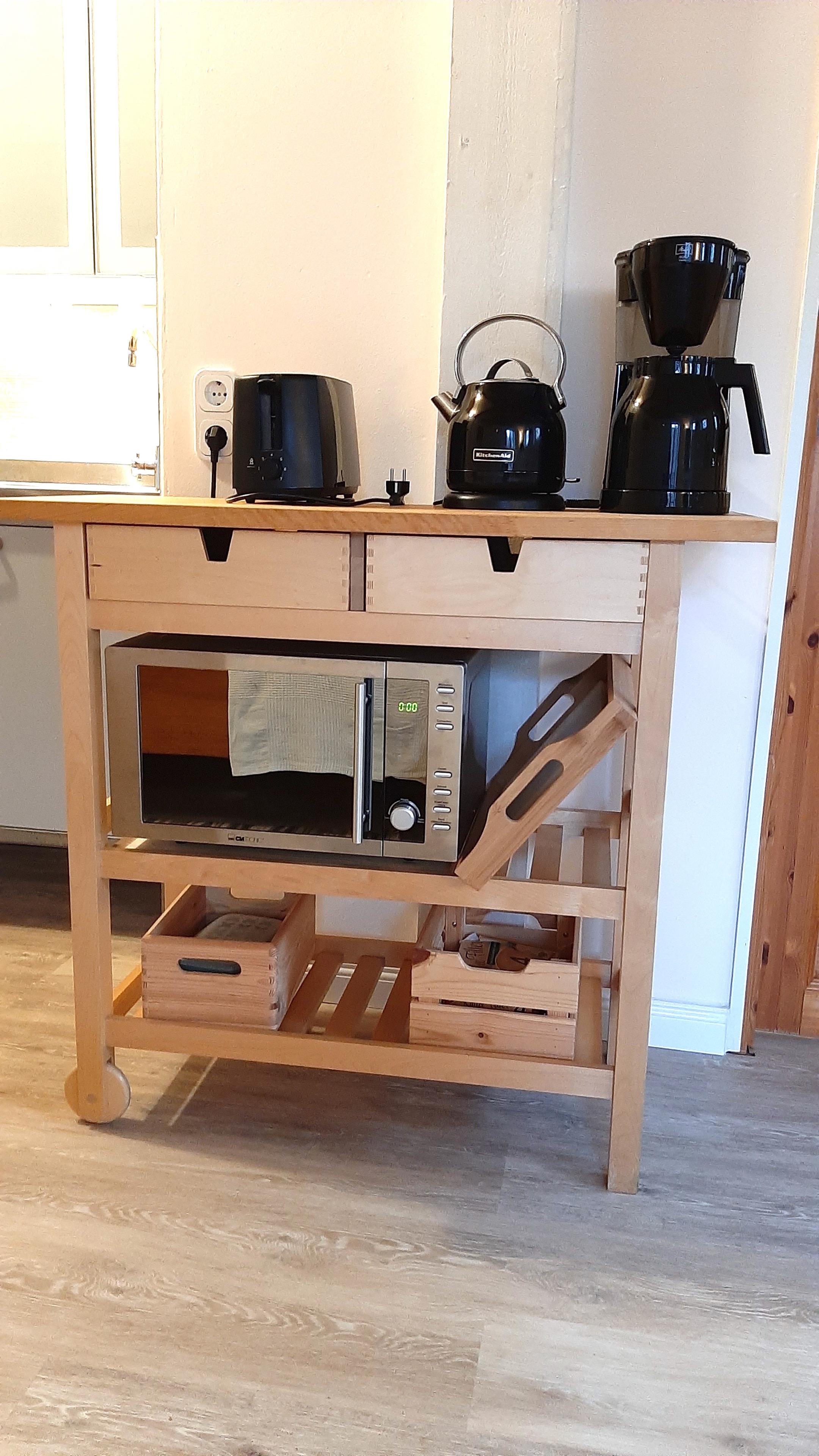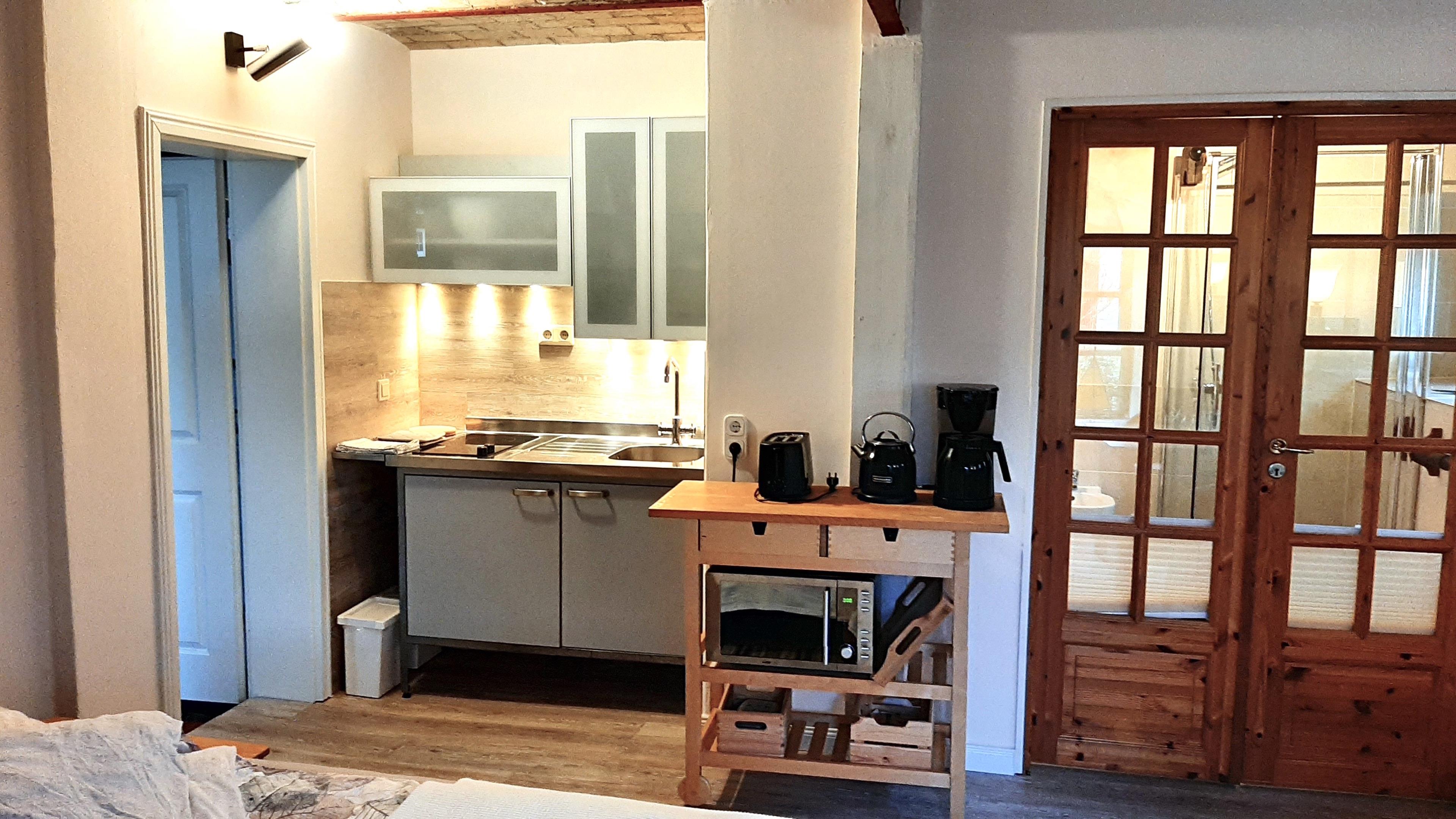 Die Küchenecke ist ausgestattet mit einem Zwei-Feld-Ceranherd, Spüle und Kühlschrank, Mikrowelle, Kaffeemaschine, Wasserkocher, Toaster, Geschirr und Besteck.