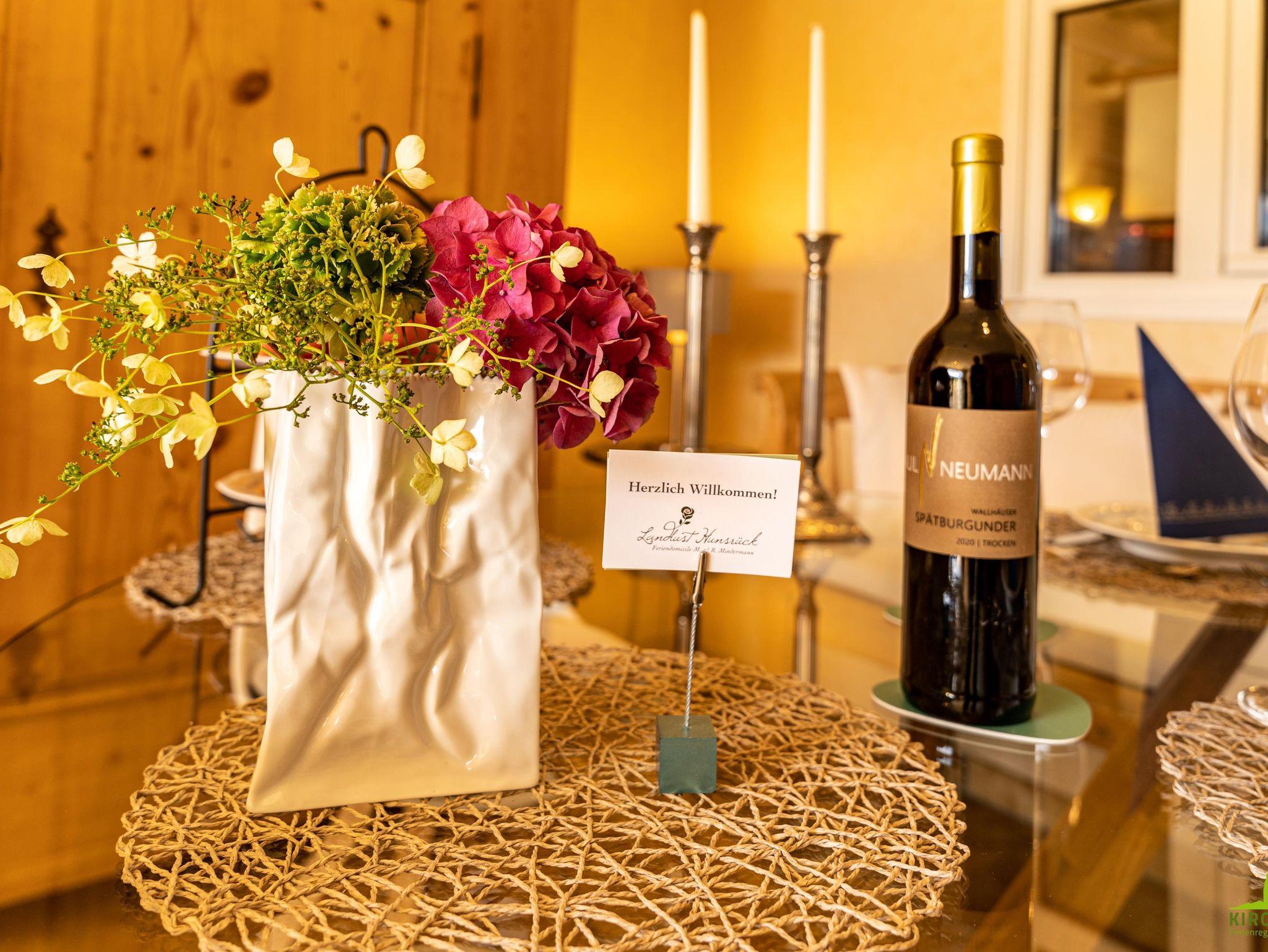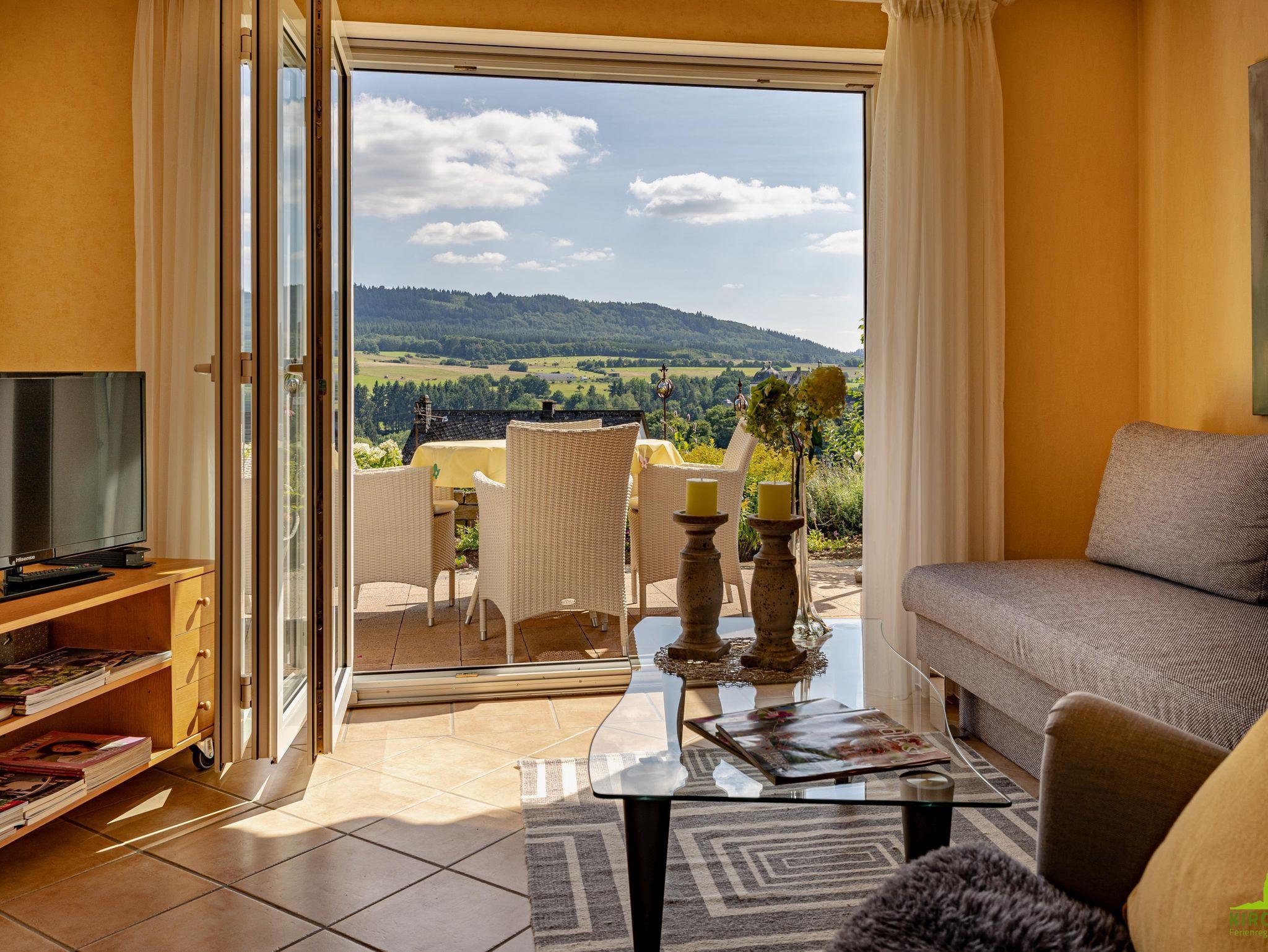 Komfortable, helle *****Ferienwohnung, Südhanglage, mit bodentiefen Fenstern und herrlicher, unverbauter Fernsicht auf den Soonwald und Ort und Schloß Gemünden. Ruhig am Ortsrand gelegen und excellent ausgestattet. Mit großer Terasse und herrlicher Aussicht auf Soonwald und Schloss Gemünden. Waschmaschine und Trockner, Garten zur Alleinbenutzung. Ideal zum Relaxen und als Basilager für Ausflüge zur Hängeseilbrücke, den Weinbaugebieten Rhein, Mosel, Nahe, Soonwaldsteig, Traumschleifen, Schinderhannes Radweg etc. etc. Gute Wandermöglichkeiten! Fünf *****Sterne Qualität für 2 Personen am besten geeignet. Schlafcouch im Wohnzimmer für 3. evtl. auch 4. Person möglich. Wir bieten Hotelqualität, (inclusive Bademänteln) sämtliche Verbrauchsartikel sind bei Anreise vorrätig! (Bademäntel ohne Aufpreis!)