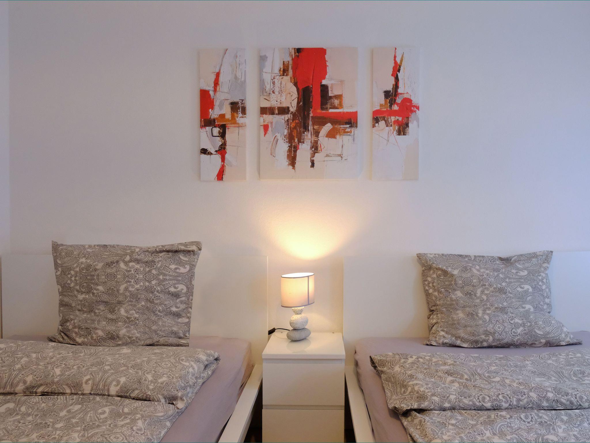 Die Wohnung befindet sich im Erdgeschoss eines Mehrfamilienhauses. Es sind 2 Schlafzimmer mit je 2 französichen Betten einem Nachtisch und einem Kleiderschrank vorhanden.
