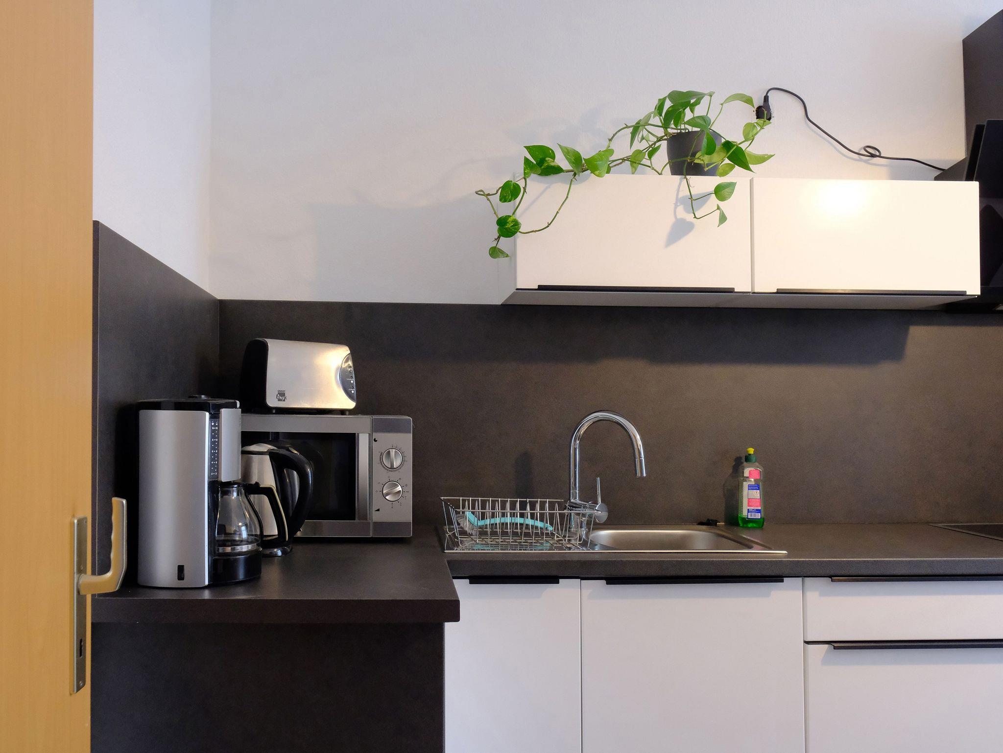 In der Wohnung befindet sich ein Küche mit reichlicher Ausstattung (Herd, Microwelle, Kühlschrank, Toaster, Kaffeemaschine, Spüle, Besteck, Teller, Töpfe). Ausserdem gibt es ein großes Bad mit Wanne/Dusche/WC/Waschmaschine. Der Aufenthaltraum mit Sitz/Essmöglichkeit/Garderobe für 4 Personen rundet das Gefühl zu Hause zu sein ab.