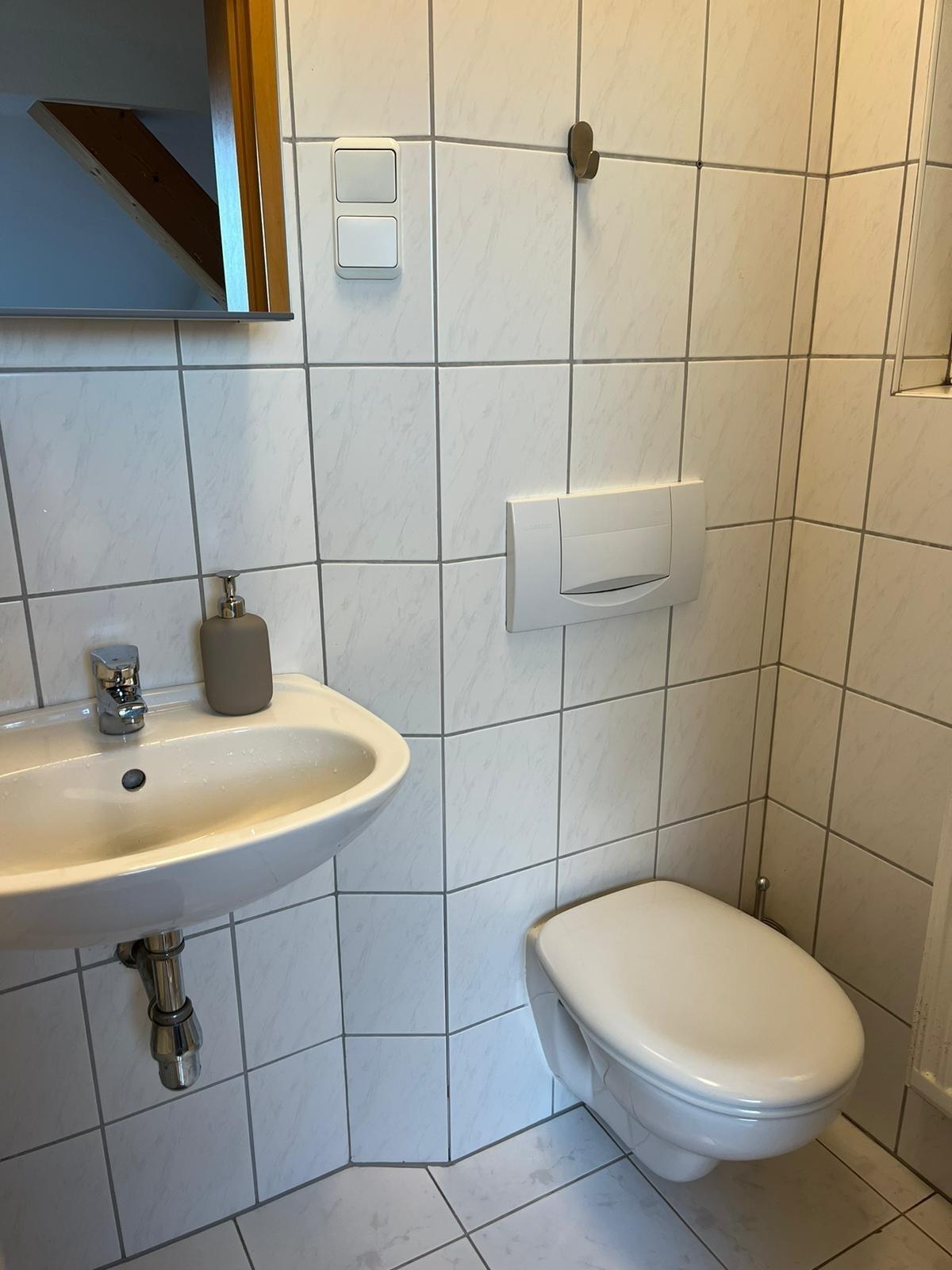 Im kleinen gemütlichen Badezimmer befindet sich ein Waschbecken mit Spiegelschrank, eine Toilette und eine Dusche.