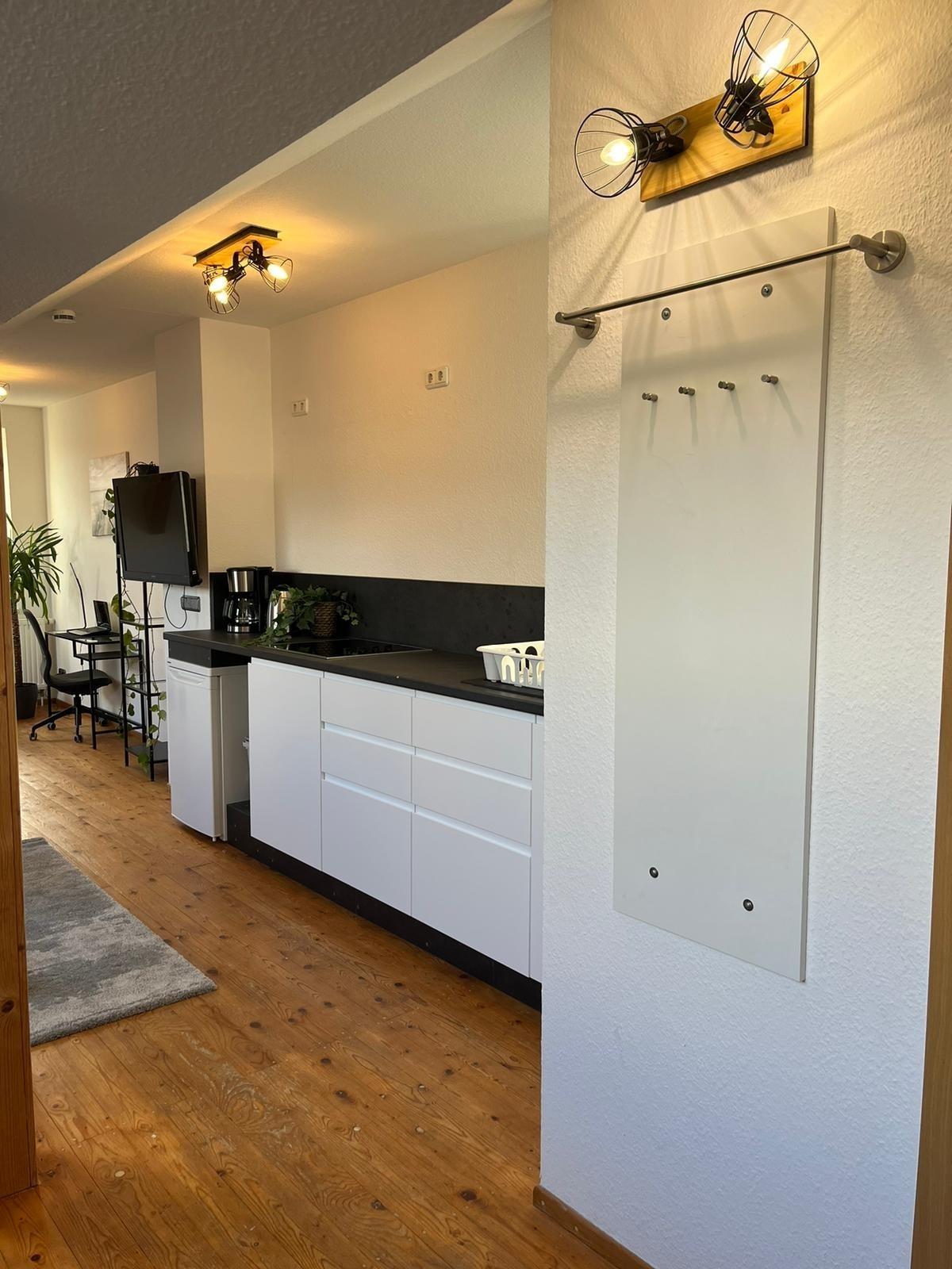 Die Küche mit Wohnbereich verfügt über alle notwendigen Kochutensilien z.B. Kühlschrank, Wasserkocher, Herdplatten, Töpfe, Teller, Tassen, Besteck usw. Diese sind in einer Einbauküche untergebracht. Außerdem können bis zu 2 Personen an den vorhandenen Tisch bequem das Essen vorbereiten und einnehmen.