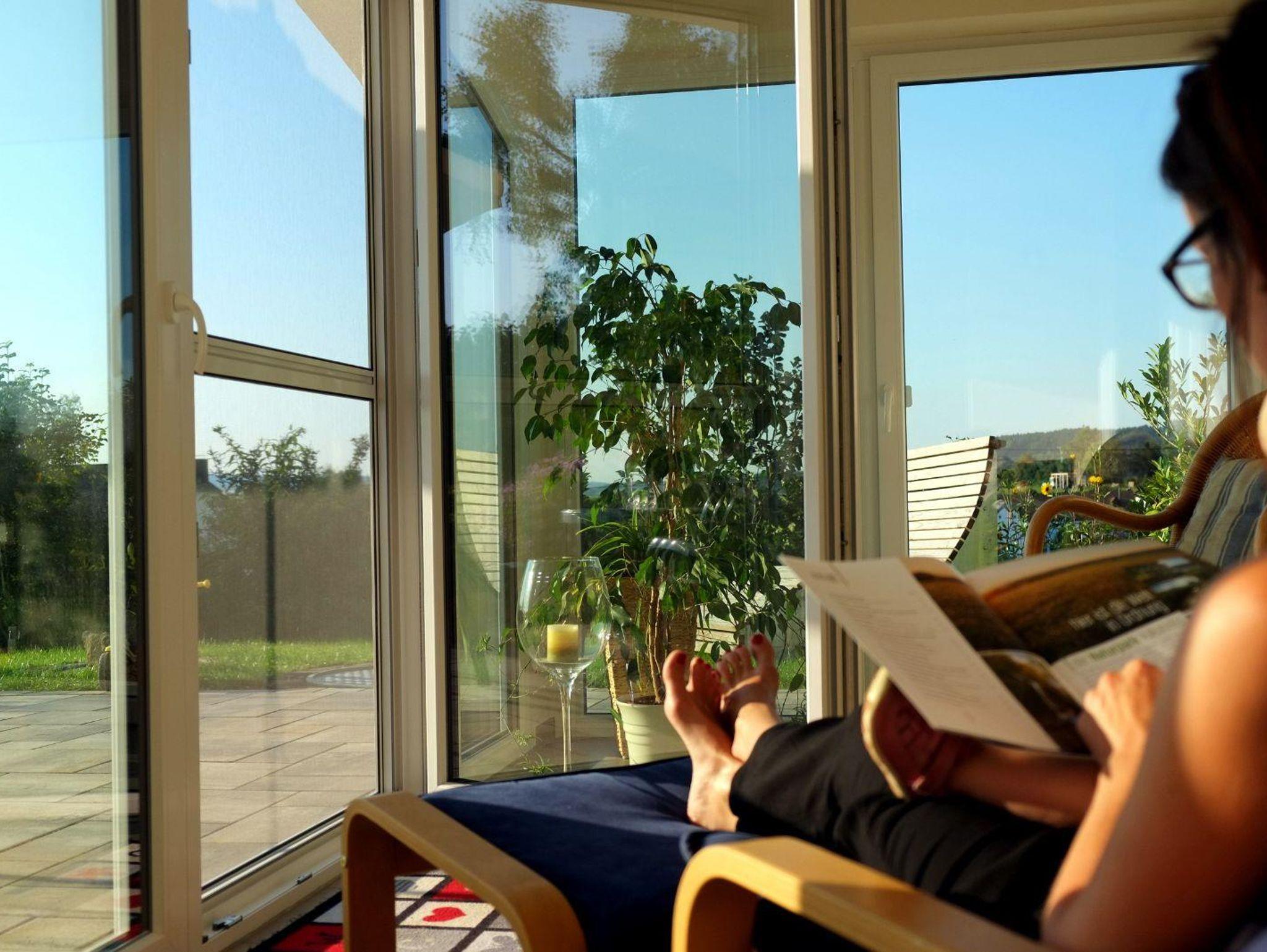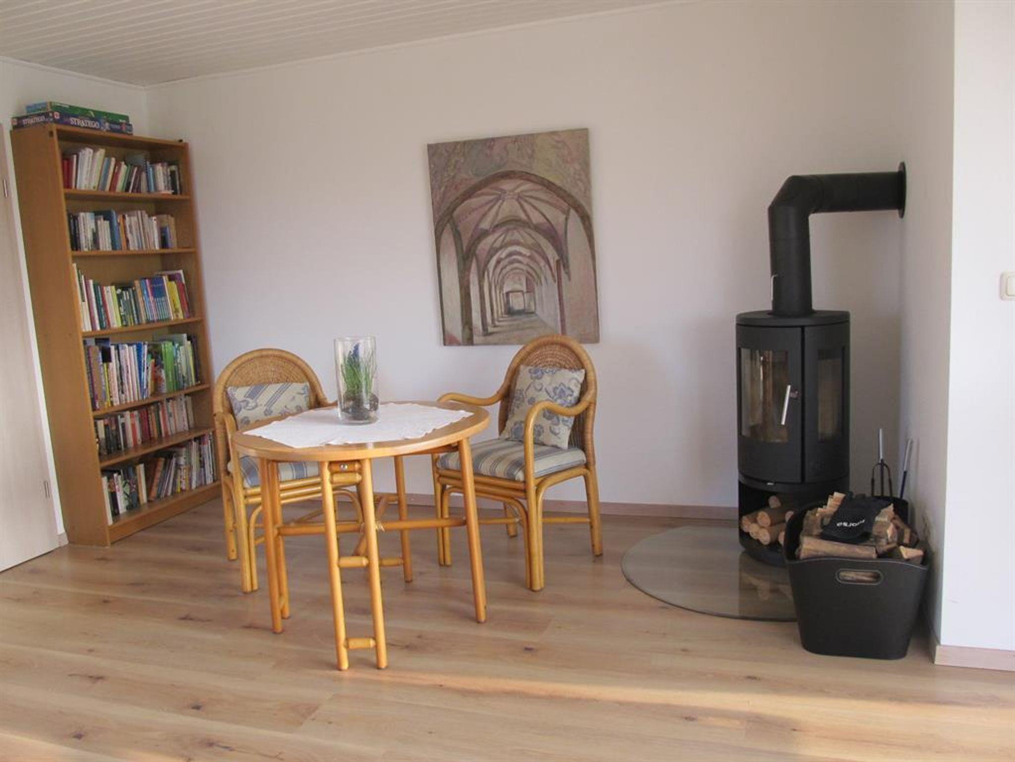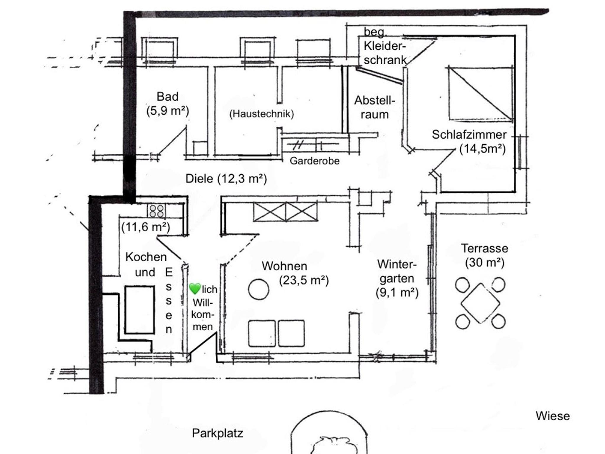In der neu eingerichteten Küche mit Spülmaschine, Backofen, Mikrowelle und Gefrierfach befindet sich gleichzeitig die gemütliche Essecke, bestens geeignet für das gemeinsame Essen und/oder kurzweilige Spieleabende. Eine kleine Spieleauswahl finden Sie im Wohnzimmer. Im Wohnzimmer finden Sie auch einen Kaminofen, Holz zum Befeuern stellen wir auf Wunsch gegen Gebühr zur Verfügung, einen Sat-TV und eine Stereoanlage. Der Wintergarten grenzt unmittelbar an das Wohnzimmer und bietet Ihnen eine Weitsicht über Wiesen und Wald. Auf der Terrasse stehen Ihnen Gartenmöbel und ein Grill zur Verfügung. Das Schlafzimmer bietet Ihnen ein Doppelbett und einen begehbaren Kleiderschrank mit eingebautem Digital-Safe. Im geräumigen Bad befindet sich eine ebenerdige Dusche.