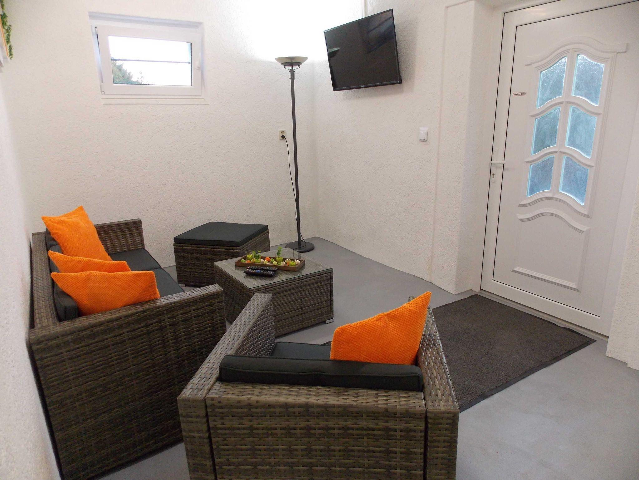 Ausstattung Wohnzimmer: Schlafcouch (Aufbettungsmöglichkeit, Utensilien und Bettwäsche zur Aufbettung sind vorhanden), moderne Wohnwand, Couchtisch, Sonnen- und Insektenschutzplissee, Ventilator, Sat-TV und -Radio, DVD-Player mit einer DVD-Auswahl verschiedener Filmgenre, Bücher sowie eine kleine Gesellschaftsspielesammlung