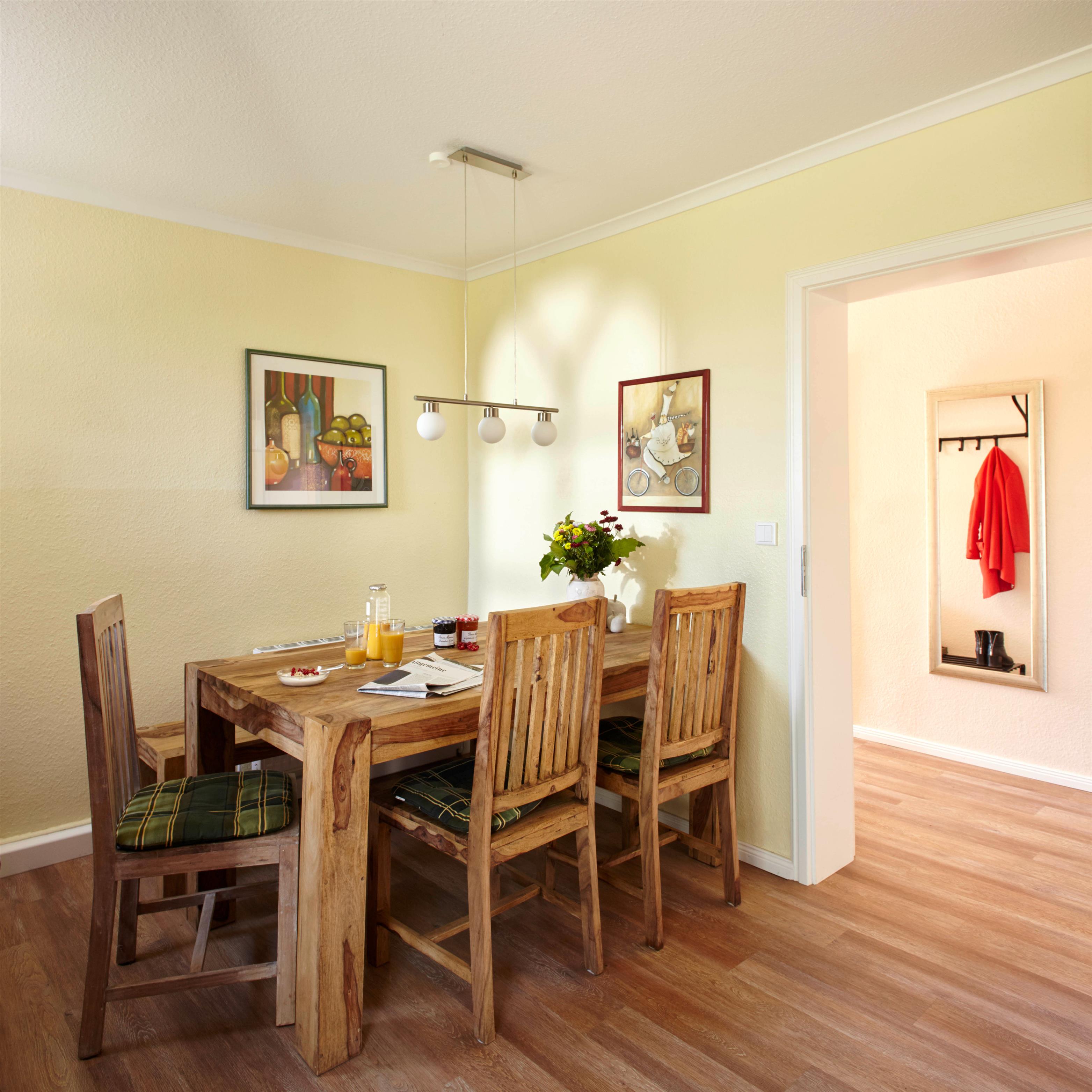 Die separate gelegene Küche ist vollausgestattet und mit einer Essecke eingerichtet. Von hier gelangt man direkt auf die wohnungseigene Terrasse mit angrenzendem kleinen Garten.