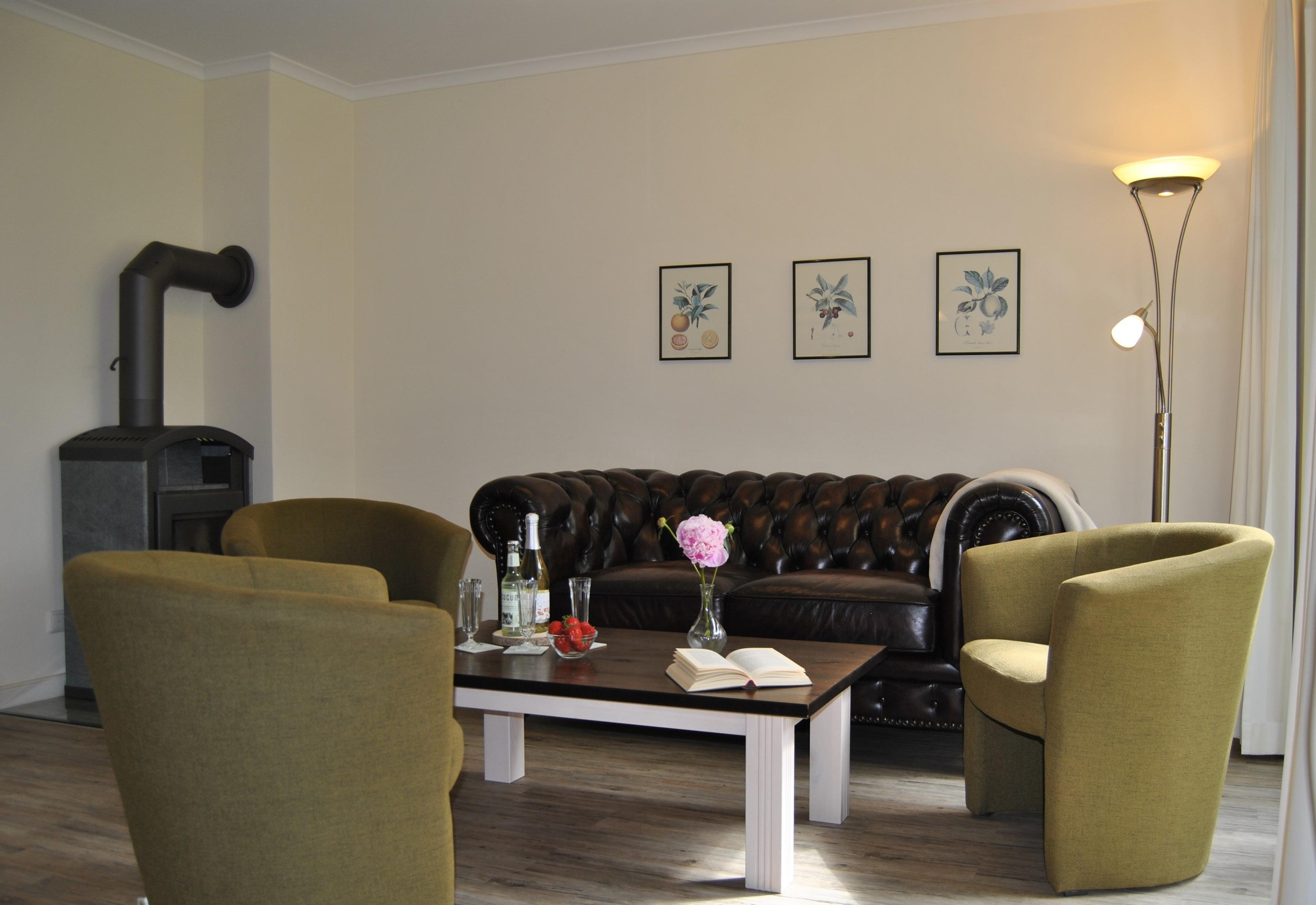 Das Wohnzimmer mit einer bequemen Sitzgruppe und Kamin lädt zu gemütlichen Abenden ein. Ebenfalls befindet sich hier eine vollausgestattete Küchenzeile mit Essbereich. Vom hier tritt man direkt auf die Bangkiraiterrasse.