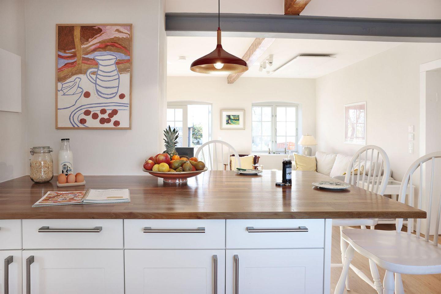 Das Haus bietet viel Platz und Rückzugsmöglichkeiten für 9 Personen. Die Wohnküche eignet sich ideal zum gemeinsamen Kochen. Der großzügige Esstisch bietet 10 Personen Platz – und den Raum für lange Spieleabende.