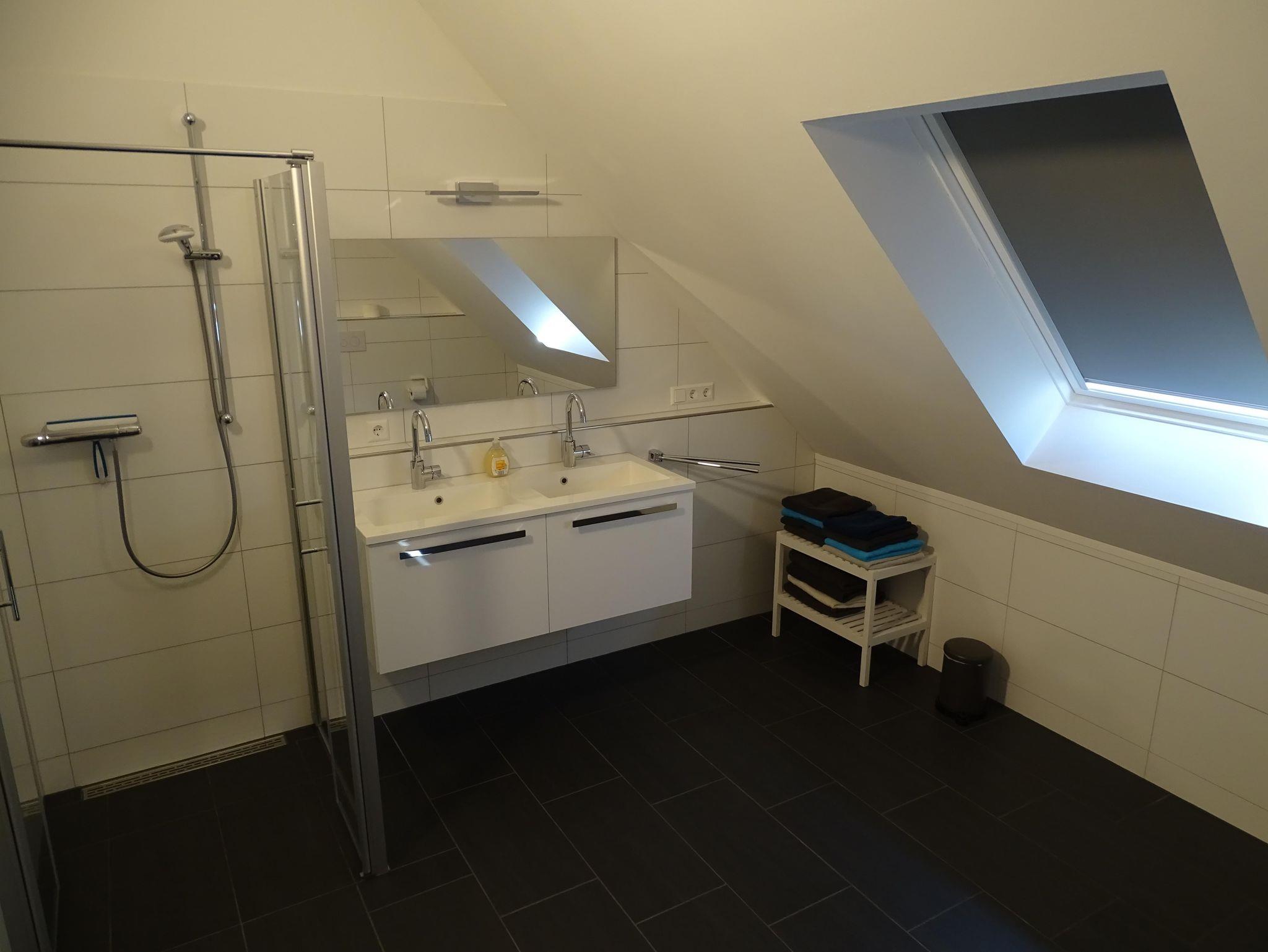 Das Badezimmer im ersten Stock befindet sich zwischen den beiden Schlafzimmern und ist sehr geräumig. In diesem Badezimmer befindet sich auch eine Toilette, sowie zwei geräumige Waschbecken und eine Duschkabine.