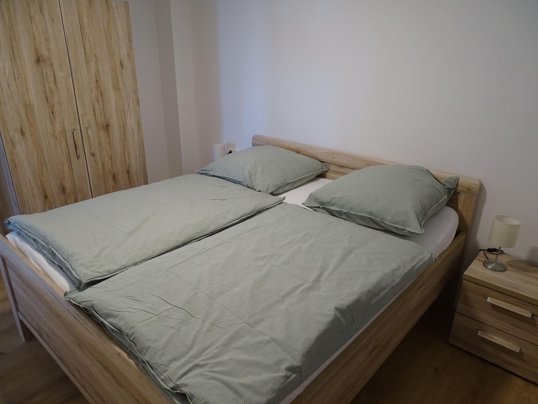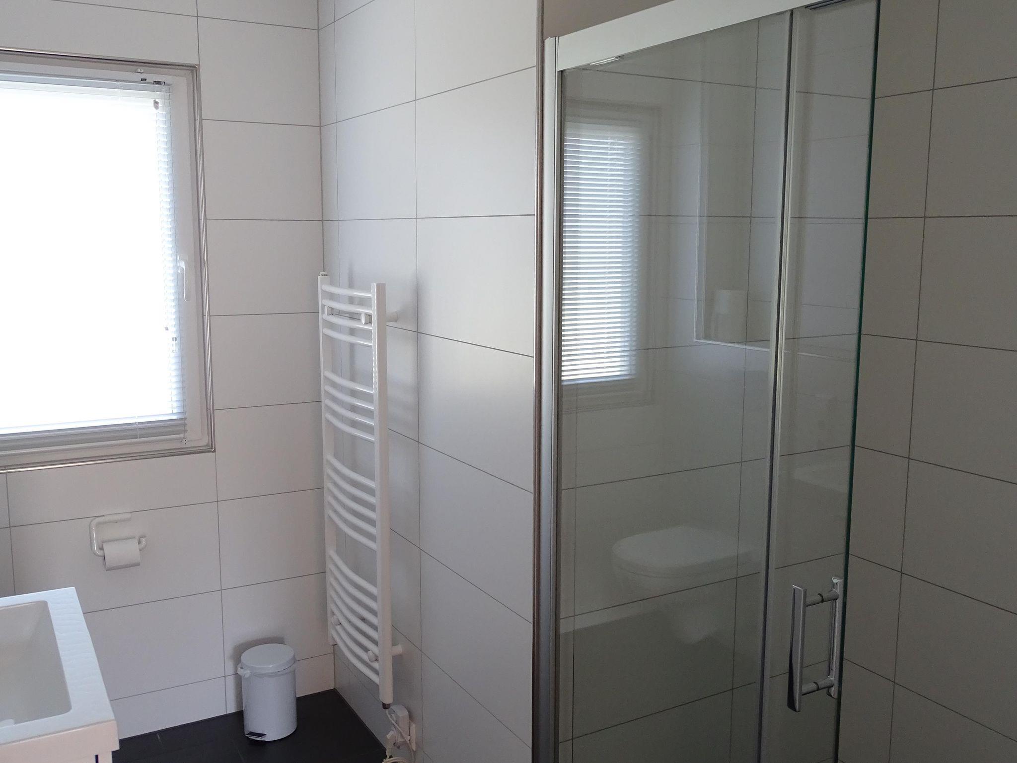 Das Badezimmer im Erdgeschoss verfügt über eine Toilette, ein Doppelwaschbecken und eine geräumige Duschekabine. Das Schlafzimmer im Erdgeschoss verfügt über ein geräumiges Doppelbett und einen großen Kleiderschrank mit Spiegel. Im ersten Stock befinden sich zwei Schlafzimmer, eines mit Doppelbett, Kleiderschrank und Sitzecke mit einem Sesseln. Das dritte Schlafzimmer hat zwei Einzelbetten, einen Kleiderschrank und eine Sitzgelegenheit mit einem Sessel.
