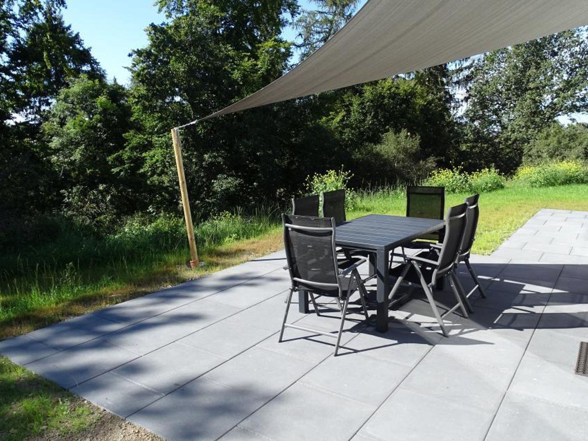 Der private Garten des Ferienhauses verfügt über eine großzügige Terrasse mit Terrassentisch und sechs luxuriösen Gartenstühlen, Rasen, Pflanzen und abgeschlossen mit einer Buchenhecke. Das Ferienhaus bietet Platz für 2 Autos.