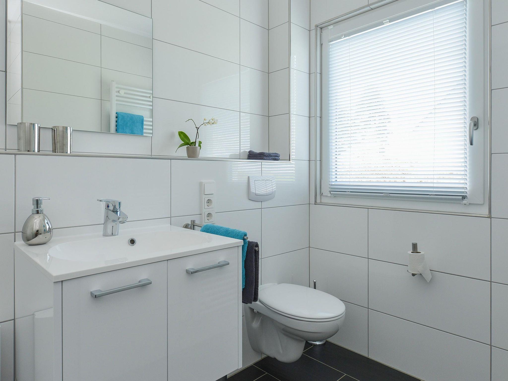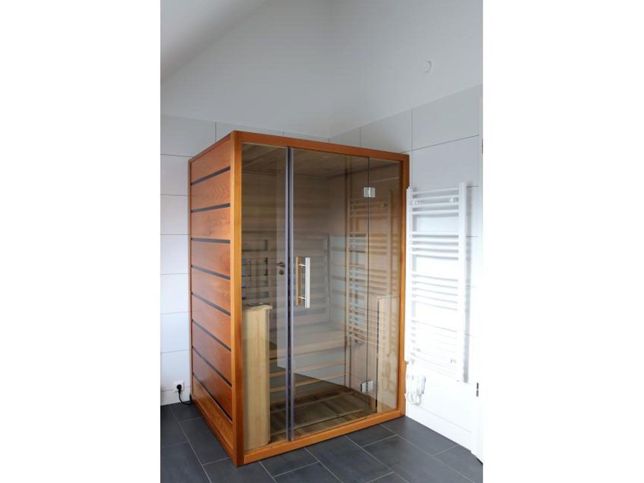 Das Badezimmer im ersten Stock befindet sich zwischen den beiden Schlafzimmern und ist sehr geräumig. In diesem Badezimmer befindet sich auch eine Toilette, sowie zwei geräumige Waschbecken und eine Duschkabine mit Regendusche. Es gibt auch eine schöne Infrarotsauna in diesem Badezimmer.