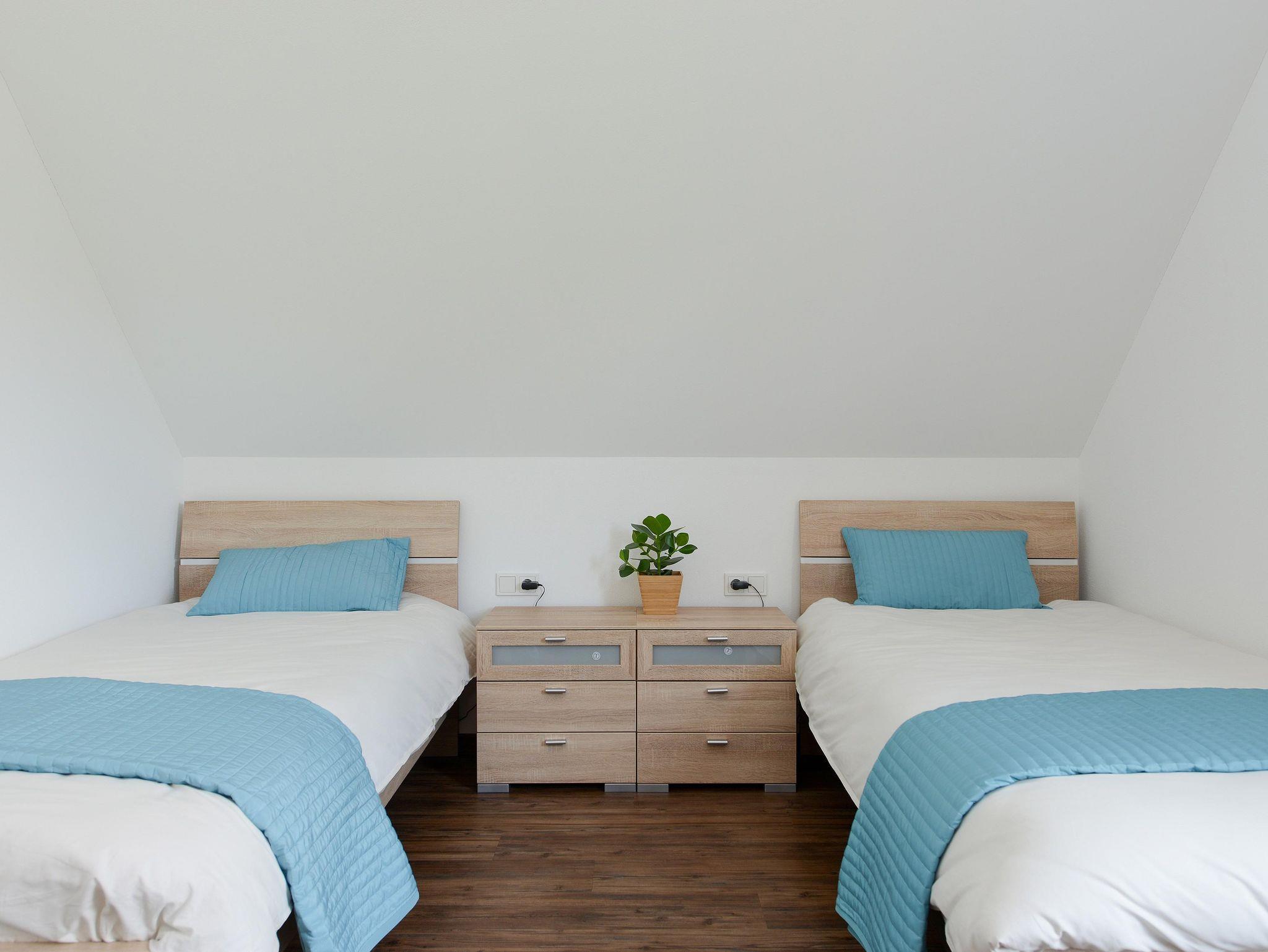 Das Badezimmer im Erdgeschoss verfügt über eine Toilette, ein Doppelwaschbecken und eine geräumige Regendusche. Das Schlafzimmer im Erdgeschoss verfügt über ein geräumiges Doppelbett und einen großen Kleiderschrank mit Spiegel. Im ersten Stock befinden sich zwei Schlafzimmer, eines mit Doppelbett, Kleiderschrank und Sitzecke mit zwei Sesseln. Das dritte Schlafzimmer hat zwei Einzelbetten, einen Kleiderschrank und eine Sitzgelegenheit mit einem Sessel. Das Badezimmer im ersten Stock befindet sich zwischen den beiden Schlafzimmern und ist sehr geräumig. Im Badezimmer ist eine Toilette vorhanden, sowie Doppelwaschbecken und eine Duschkabine. In diesem Badezimmer befindet sich auch eine Infrarotkabine.