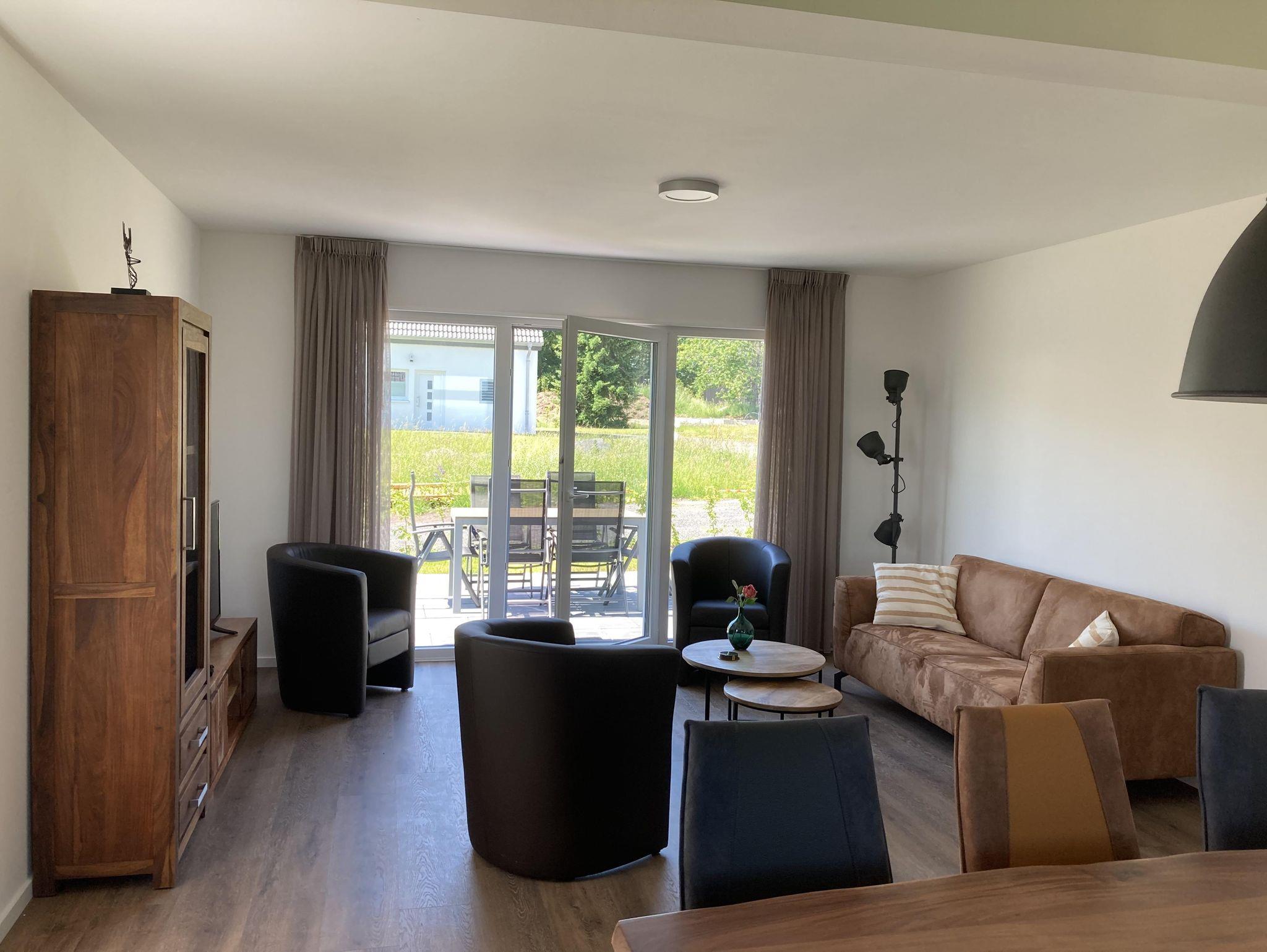 Das Wohnzimmer verfügt über eine Sitzecke mit einem geräumigen 2,5-Sitzer-Sofa, drei Sesseln, Flachbild-TV und einem großen Esstisch für 6 Personen. Für eine perfekte Temperatur im Haus ist das gesamte Haus mit einer Fußbodenheizung ausgestattet. Der Essbereich verfügt über einen geräumigen Esstisch mit 6 Stühlen, an dem Sie eine köstliche Mahlzeit genießen können. Die Terrasse ist durch die Terrassentüren zugänglich. Auf der Terrasse steht ein Esstisch und 6 Stühle.