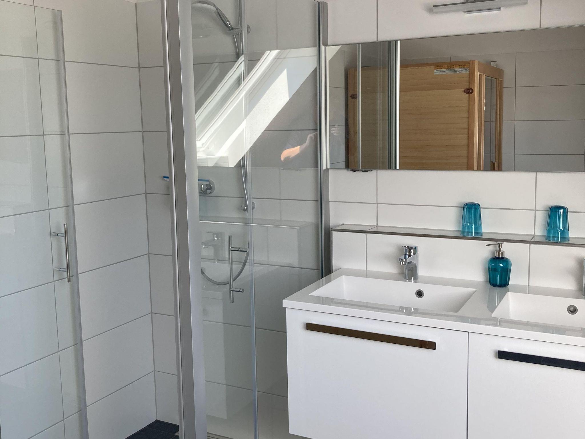 Das Badezimmer im Erdgeschoss verfügt über eine Toilette, ein Doppelwaschbecken und eine geräumige DuschKabine. Das Schlafzimmer im Erdgeschoss verfügt über ein geräumiges Doppelbett und einen großen Kleiderschrank mit Spiegel. Im ersten Stock befinden sich zwei Schlafzimmer, eines mit Doppelbett, Kleiderschrank und Sitzecke mit einem Sesseln. Das dritte Schlafzimmer hat zwei Einzelbetten, einen Kleiderschrank und eine Sitzgelegenheit mit einem Sessel. Das Badezimmer im ersten Stock befindet sich zwischen den beiden Schlafzimmern und ist sehr geräumig. Im Badezimmer ist eine Toilette vorhanden, sowie ein Doppelwaschbecken und eine Duschkabine. Es gibt auch eine schöne Infrarotsauna in diesem Badezimmer.