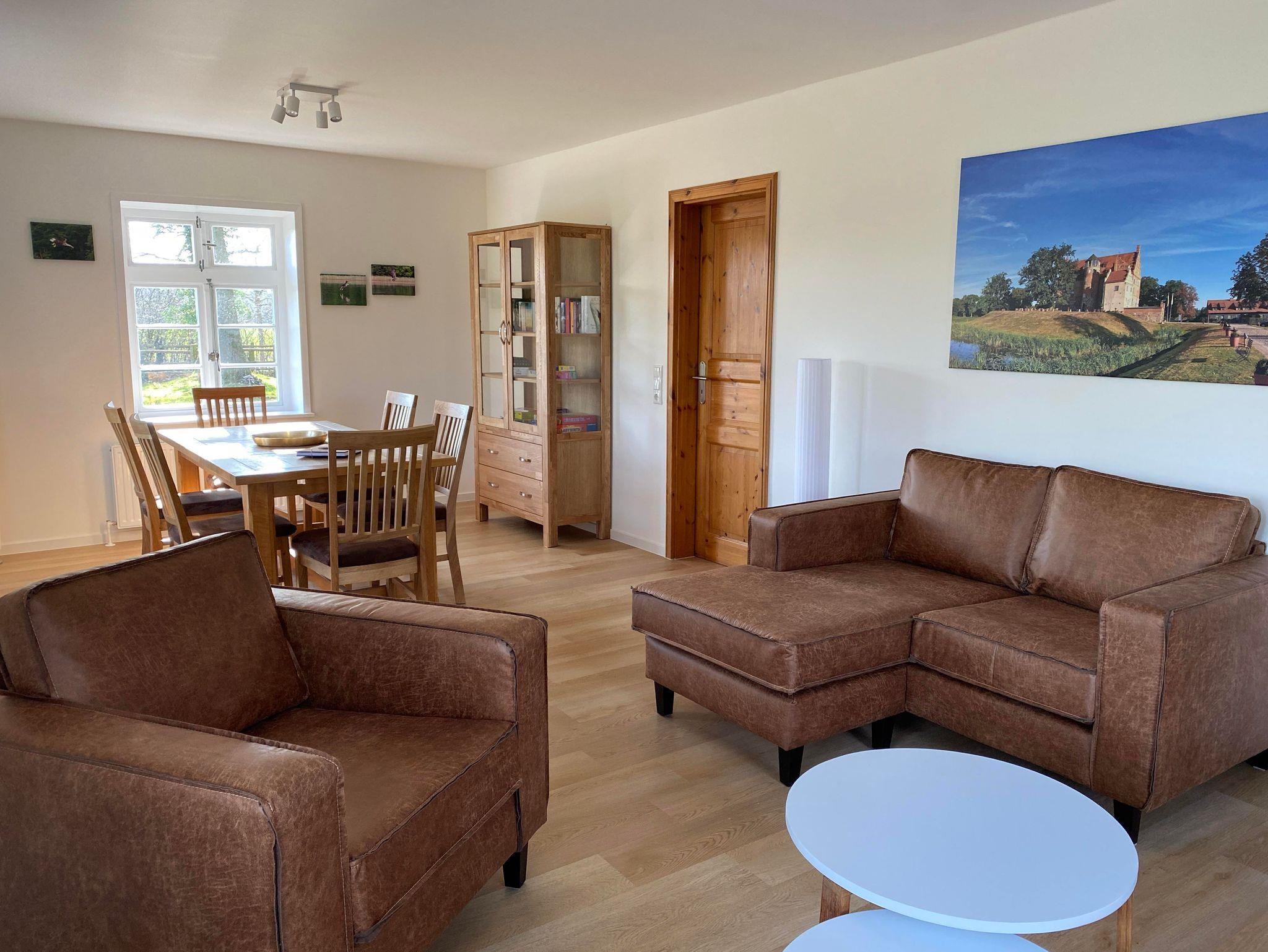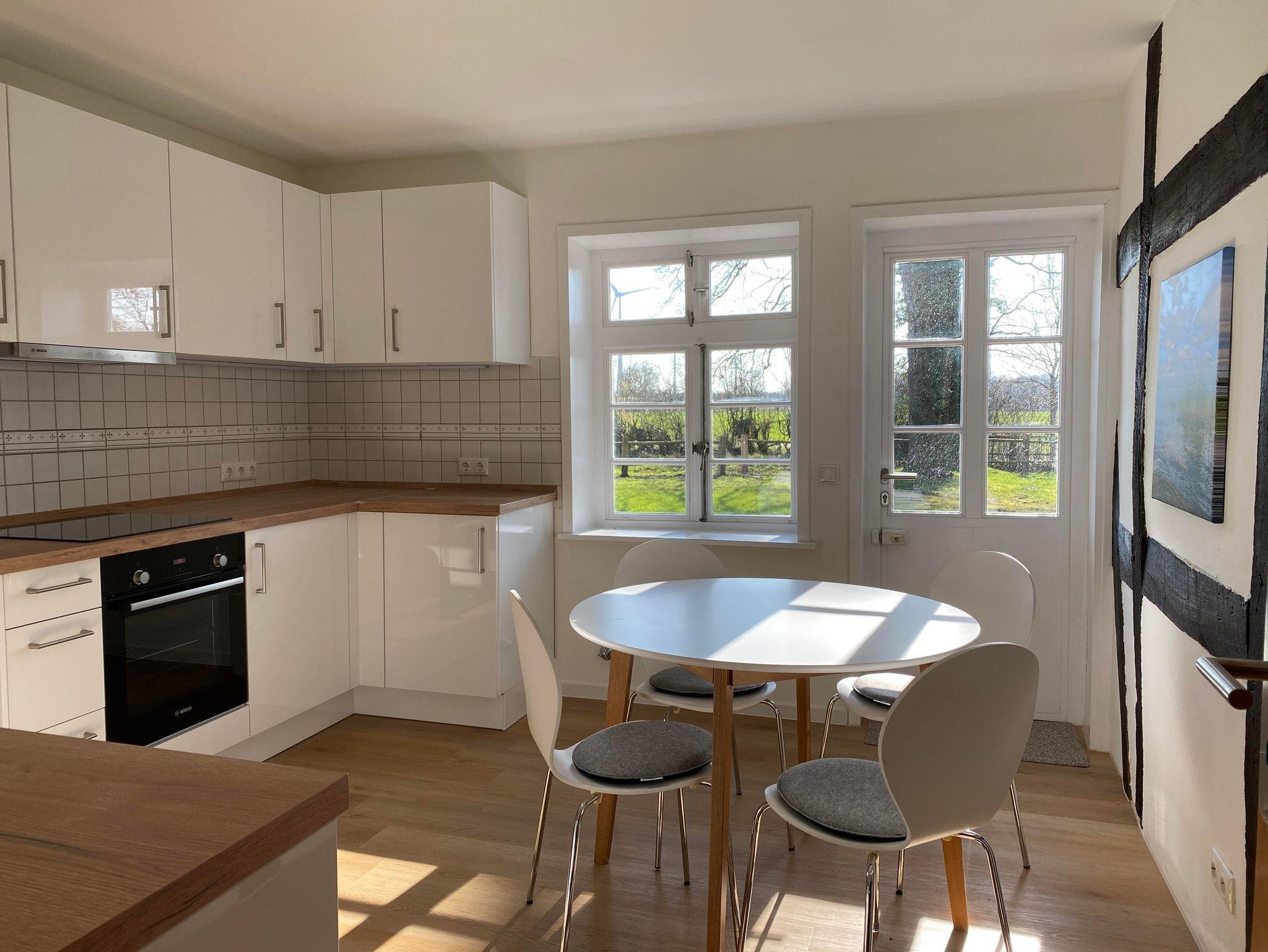 Die Wohnfläche des Fachwerkhauses „Weitblick 2“ befindet sich ausschließlich im Erdgeschoss und umfasst insgesamt ca. 105 m². Vom großzügigen Flur aus gelangt man in einen geräumigen Wohn-Essbereich und in die separate Küche mit direktem Zugang zu Terrasse und Garten. „Weitblick 2“ ist mit einem Badezimmer mit Dusche und WC sowie einem separaten Gäste-WC ausgestattet. Es stehen drei Schlafzimmer für insgesamt 5 Personen zur Verfügung: ein großes Schlafzimmer mit Doppelbett, ein kleines Schlafzimmer mit Doppelbett, ein Schlafzimmer mit großem Einzelbett (Breite: 1 x 140 cm).