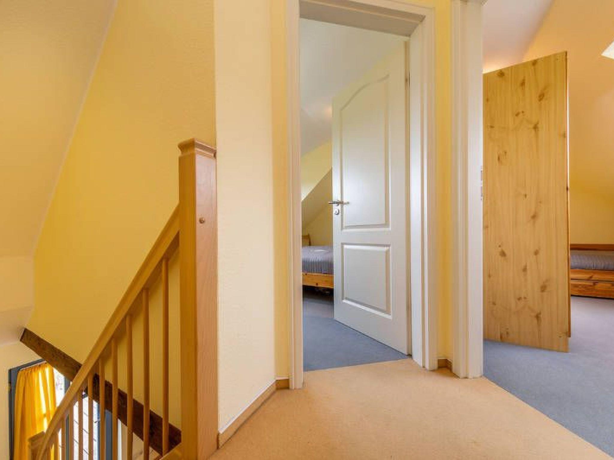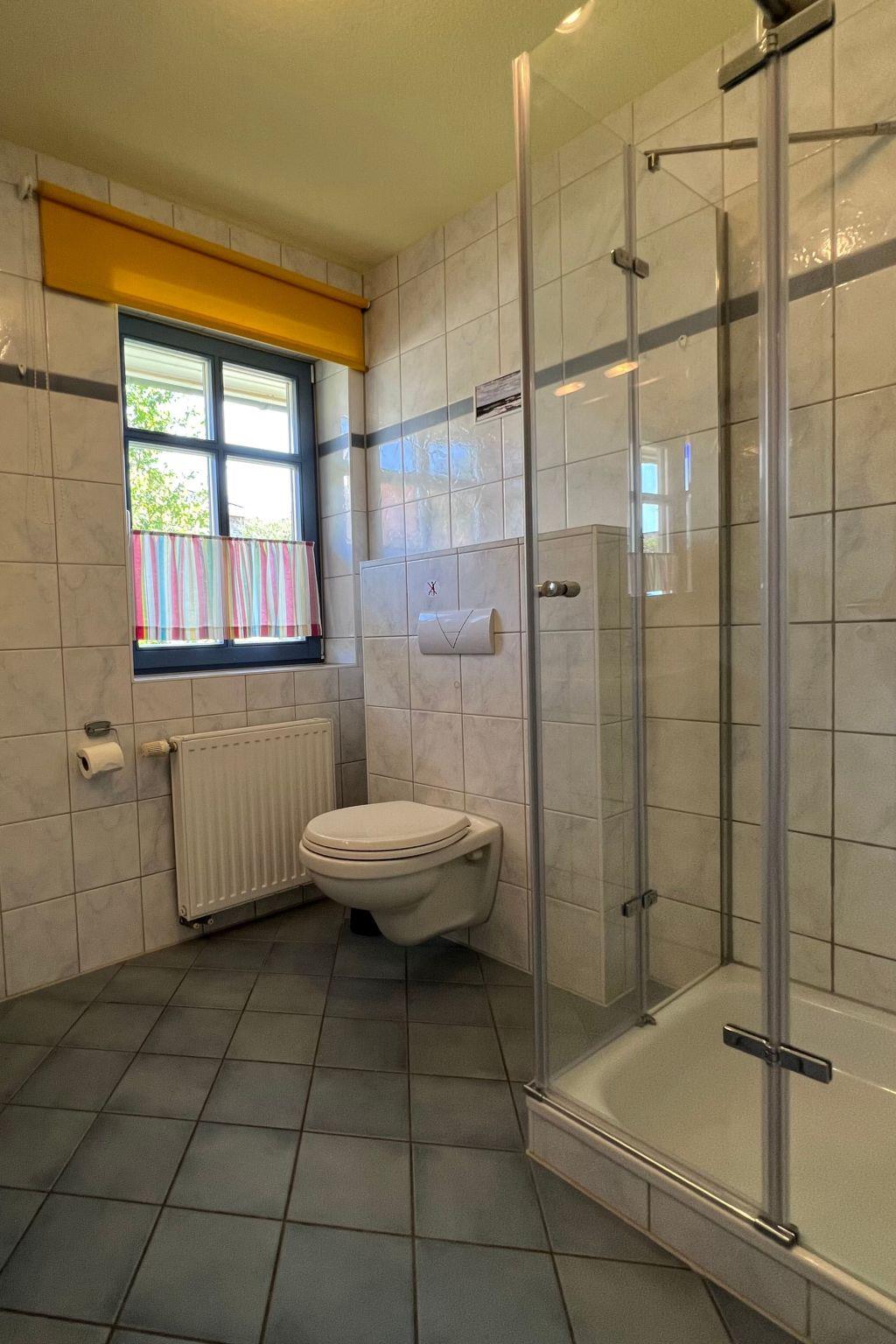 The holiday home is about 61m² in size and has 2 floors. On the upper floor there are two bedrooms, one with a double bed and travel cot and one with two single beds (some of which can be converted into extra beds). The ground floor is characterised by its historic beams. The open-plan living area with sofa bed (extra bed for a 5th person, flat-screen TV, WLAN), dining area (6 people) and open-plan kitchen (cooker, oven, fridge/freezer, dishwasher, coffee machine, toaster) looks really spacious thanks to the large window front facing the garden. The bathroom/WC with shower cubicle has a window facing the street. Bed linen (charged per person/stay) and/or towels (charged per person/stay) can be booked in addition. The costs are to be paid directly to the landlord. The terrace is equipped with weatherproof garden furniture (cushions on the upper floor). Each flat has its own car park in front of the house. In the bicycle room, which is available to all guests, not only bicycles can be locked, but also other garden furniture can be borrowed, as well as children's high chairs and toys. Please note the minimum booking of 5 nights in the high season. Gap bookings of 2 nights or more are possible on request.