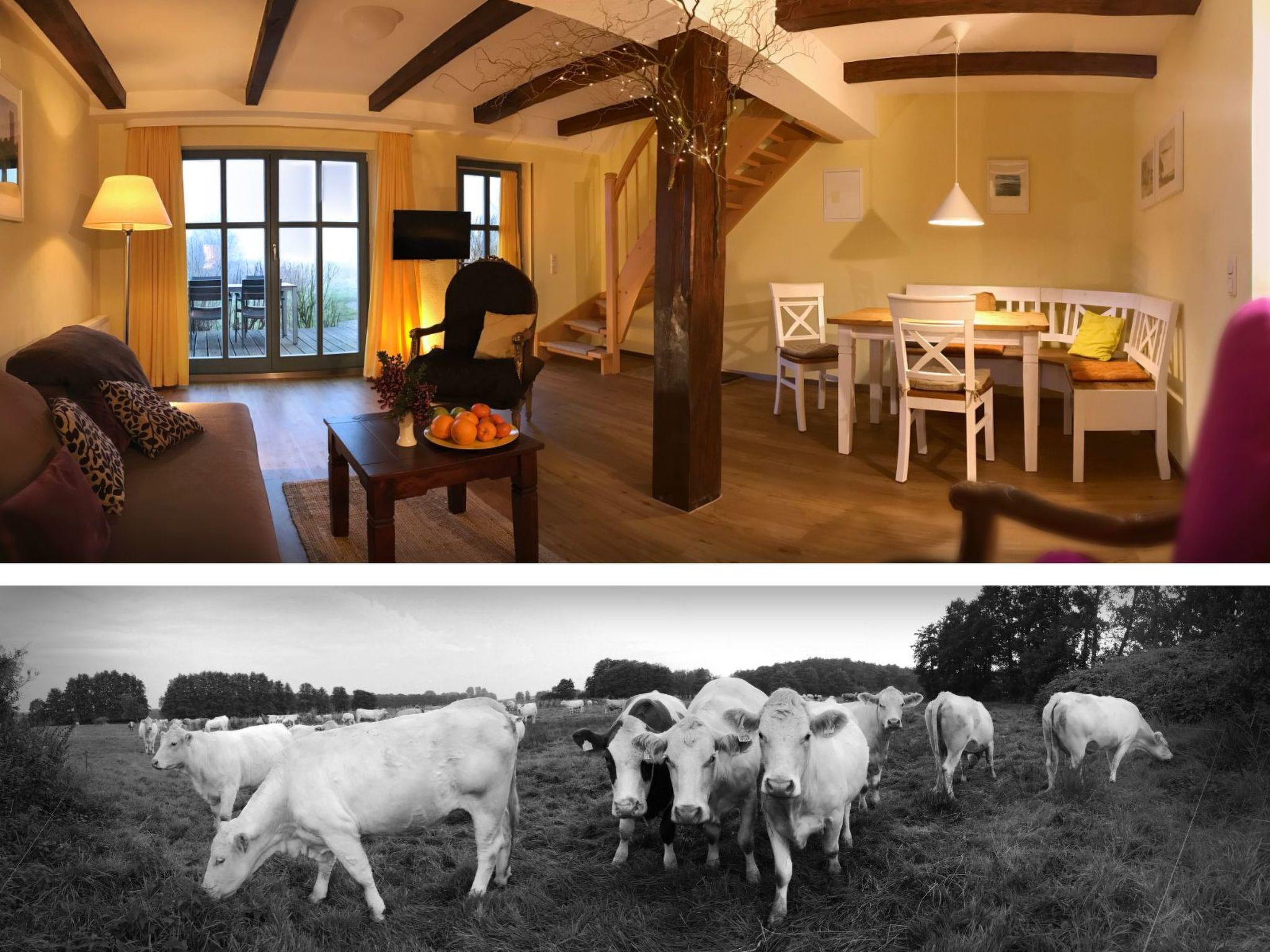 Mein Fleckchen Rügen is a holiday complex of 4 terraced houses in a quiet village location. Each house has its own entrance via the tearoom side and from there a wonderful wide view over the 12000 square metre property, which is partly park-like and partly pastureland. The shared occupancy of several houses is suitable for groups or friendly families who prefer their own area despite holidaying together. (e.g. 2 houses for the price of one large one...) Because the landscape around Neuenkirchen is particularly idyllic, all seasons of the popular ZDF series "HALLO ROBBIE !" were filmed here for 9 years. Nestled between beautiful nature reserves, Neuenkirchen is an ideal starting point for cycling tours and hikes through the unique Bodden landscape, as well as to the most beautiful sandy beaches, which are just a short drive away. Tourist highlights such as the World Heritage Site and Hanseatic city of Stralsund, the Jasmund with its fantastic chalk cliffs, one of Europe's largest sea stages in Ralswieck and, last but not least, day trips to the island of Hiddensee or Cape Arkona are just a few minutes' drive away. There's just one thing you won't find in Neuenkirchen: the hustle and bustle of a seaside resort à la Binz and Co. The fact that you don't have to pay an expensive visitor's tax in Neuenkirchen won't bother anyone either ;-)