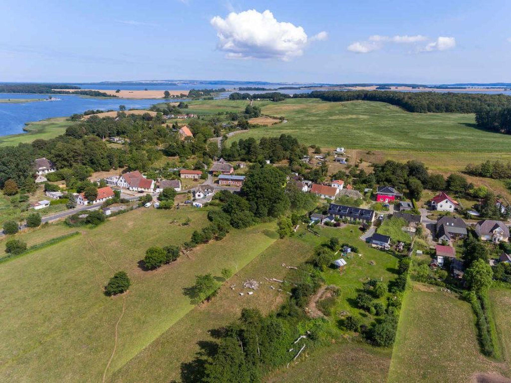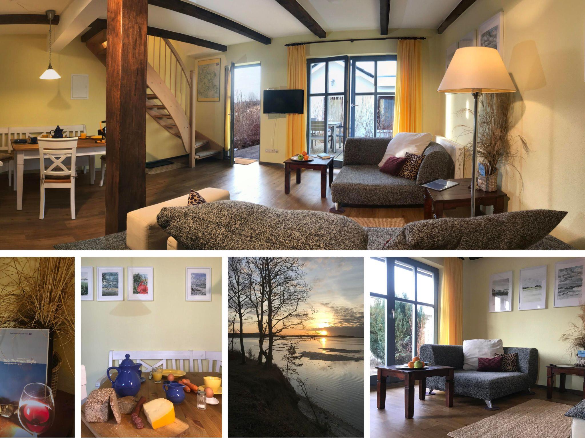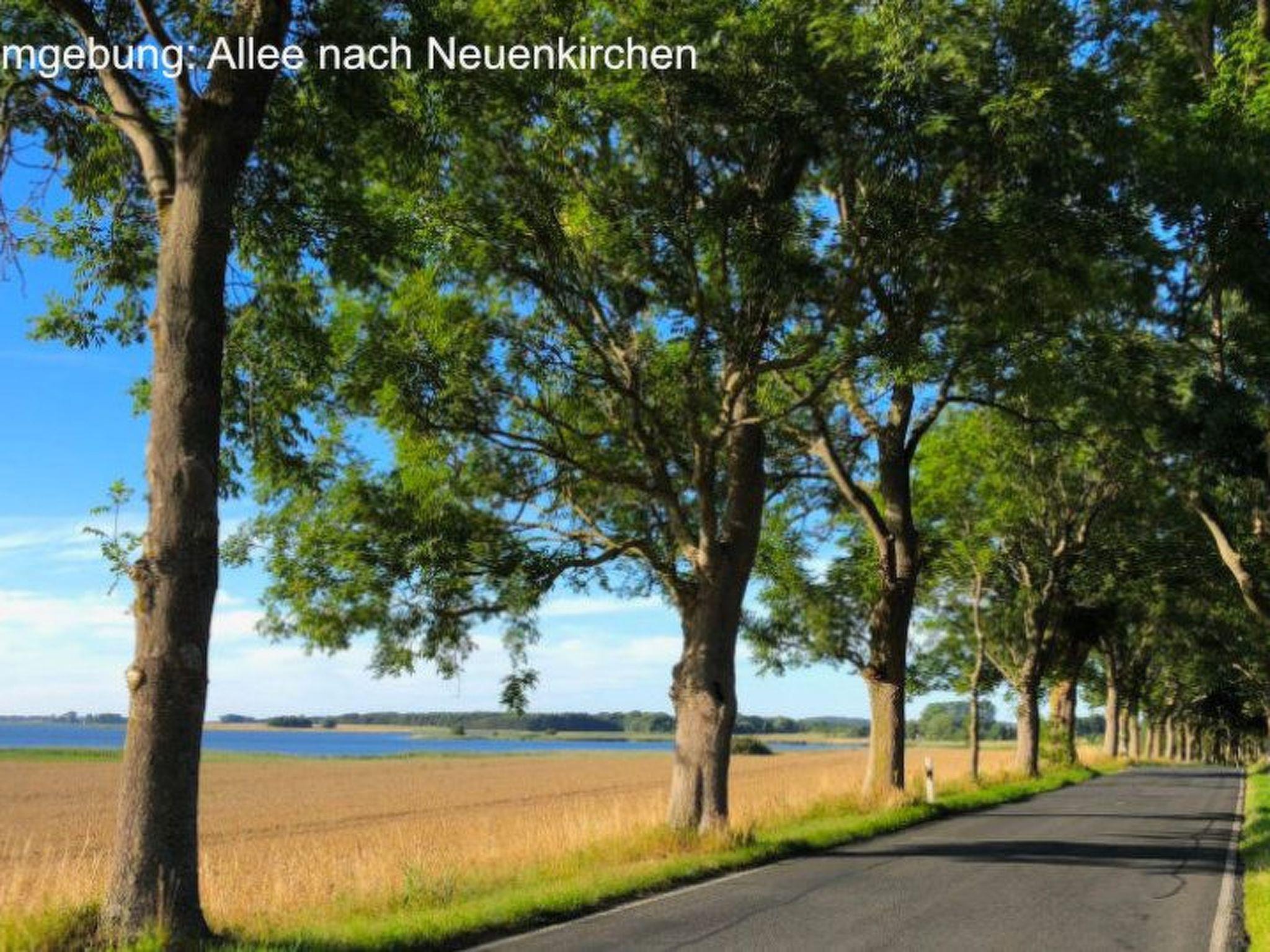 If you don't want to cook for yourself, the excellent cuisine (Mediterranean-influenced, German) of the "Wirtshaus Neuenkirchen" also provides culinary relaxation. For your daily needs, shopping in the grocery shop (bread rolls except Sunday) diagonally opposite is like travelling back in time to an ideal world. Both are about 50 metres away. The best place to buy delicious steaks is the "Wild und Rind" farm shop at the beginning of the village street. Also within walking distance is the small, pretty sandy beach for splashing around or cooling off in the Lebbiner Bodden in the evening, approx. 20 minutes directly on the former backdrop of the seal station of "Hallo Robbie". You are unlikely to see seals here, but you will find clean Bodden water, as depending on the weather, there is a strong exchange of water between the Baltic Sea and the Bodden. The local mountain of Neuenkirchen is the "Hoch Hilgor". Hike approx. 25 minutes from the holiday resort. From the observation tower you have a fantastic panoramic view of the island and, on a clear day, as far as Denmark and Møns Klint.
