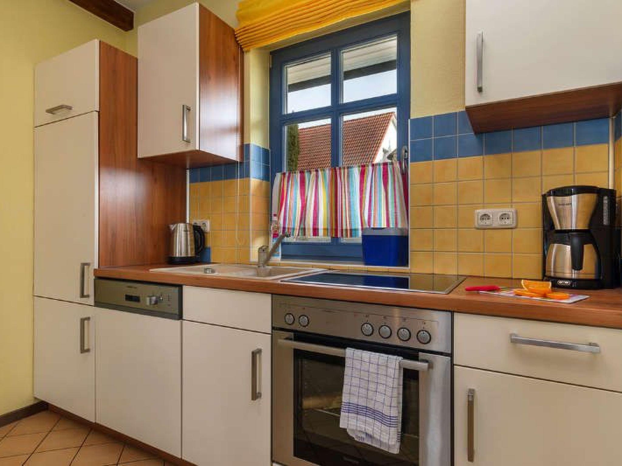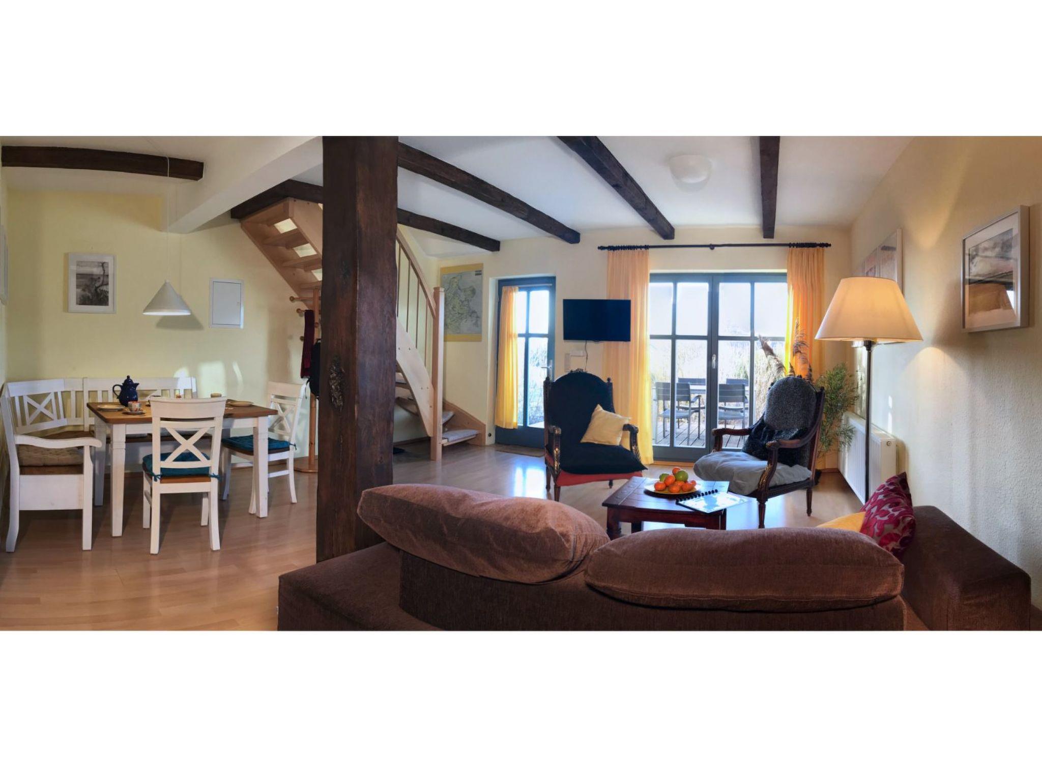 The holiday home is about 60m² in size and has 2 floors. On the upper floor there are two bedrooms, one with a double bed and travel cot and one with two single beds (some of which can be converted into extra beds). The ground floor is characterised by its historic beams. The open-plan living area with sofa bed (extra bed for a 5th person, flat-screen TV, WLAN), dining area (6 people) and open-plan kitchen (hob, oven, fridge/freezer, dishwasher, coffee machine, toaster) looks really spacious thanks to the large window front facing the garden. The bathroom/WC with shower cubicle has a window facing the street. Bed linen (charged per person/stay) and/or towels (charged per person/stay) can be booked in addition. The costs are to be paid directly to the landlord. The terrace is equipped with weatherproof garden furniture (cushions on the upper floor). Each flat has its own car park in front of the house. In the bicycle room, which is available to all guests, not only bicycles can be locked, but also other garden furniture can be borrowed, as well as children's high chairs and toys. Please note the minimum booking of 5 nights in the high season. Gap bookings of 2 nights or more are possible on request.