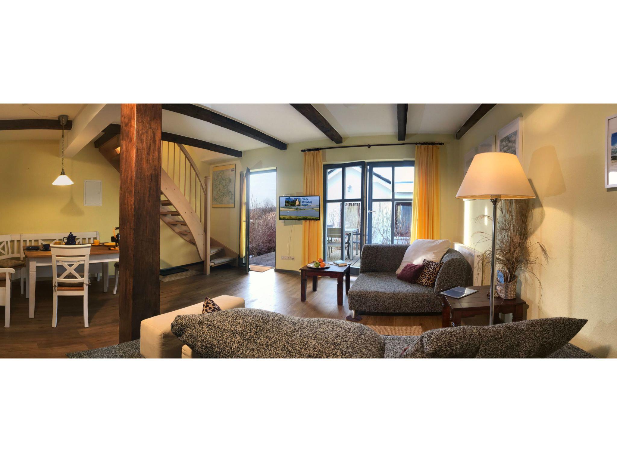 Mein Fleckchen Rügen is a holiday complex of 4 terraced houses in a quiet village location. Each house has its own entrance via the terrace side and from there a wonderful wide view over the 12000 square metre property, which is partly park-like and partly pastureland. The shared occupancy of several houses is suitable for groups or befriended families who prefer their own area despite holidaying together. (e.g. 2 houses for the price of one large one...) Because the landscape around Neuenkirchen is particularly idyllic, all seasons of the popular ZDF series "HALLO ROBBIE !" were filmed here for 9 years. Nestled between beautiful nature reserves, Neuenkirchen is an ideal starting point for cycling tours and hikes through the unique Bodden landscape, as well as to the most beautiful sandy beaches, which are just a short drive away. Tourist highlights such as the World Heritage Site and Hanseatic city of Stralsund, the Jasmund with its fantastic chalk cliffs, one of Europe's largest sea stages in Ralswieck and, last but not least, day trips to the island of Hiddensee or Cape Arkona are just a few minutes' drive away. There's just one thing you won't find in Neuenkirchen: the hustle and bustle of a seaside resort like Binz and the like. And the fact that you don't have to pay an expensive visitor's tax in Neuenkirchen won't bother anyone either ;-)