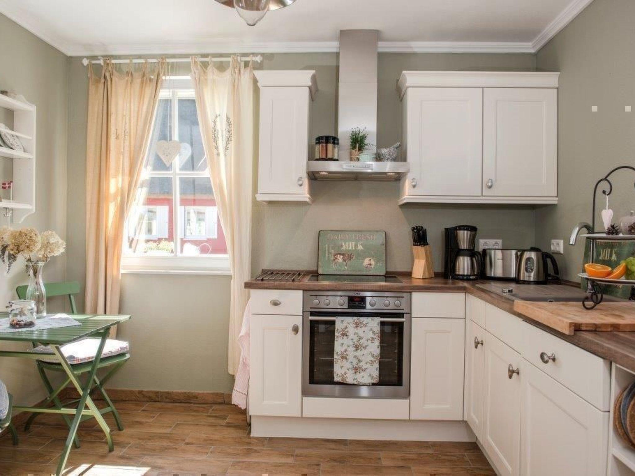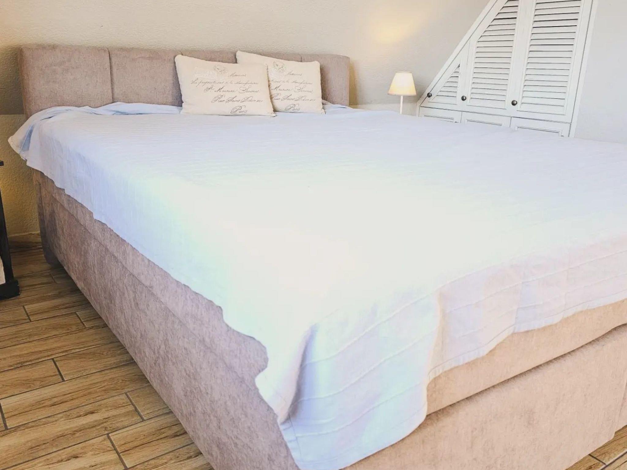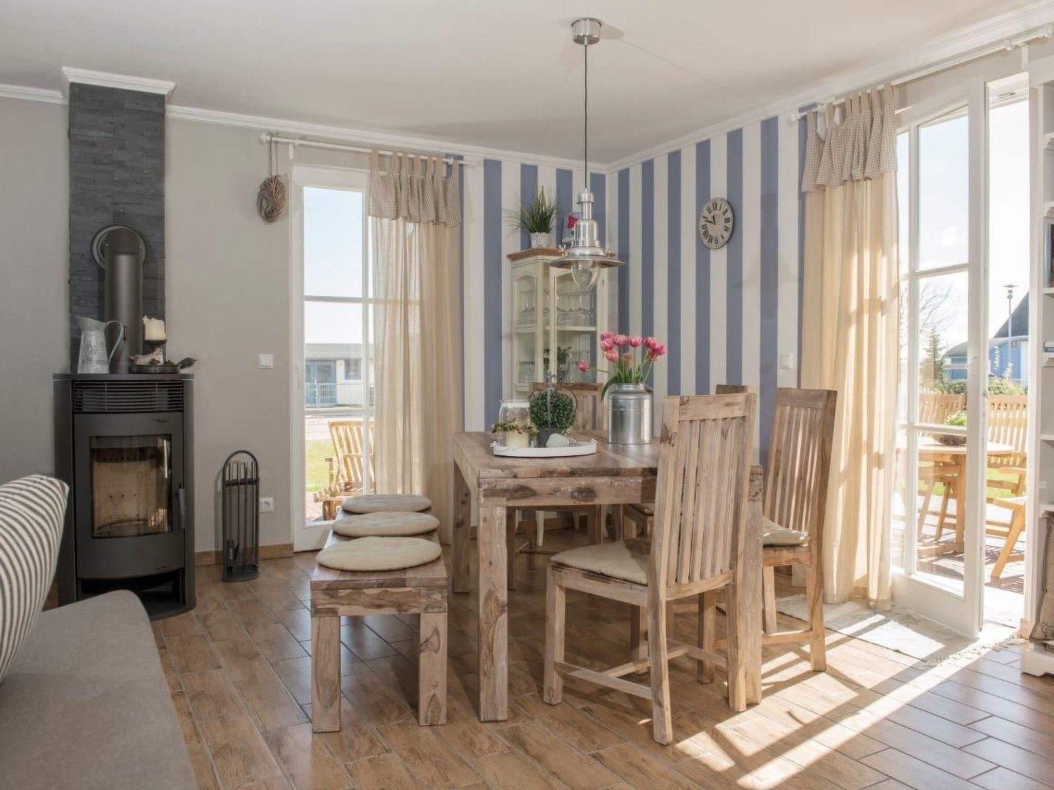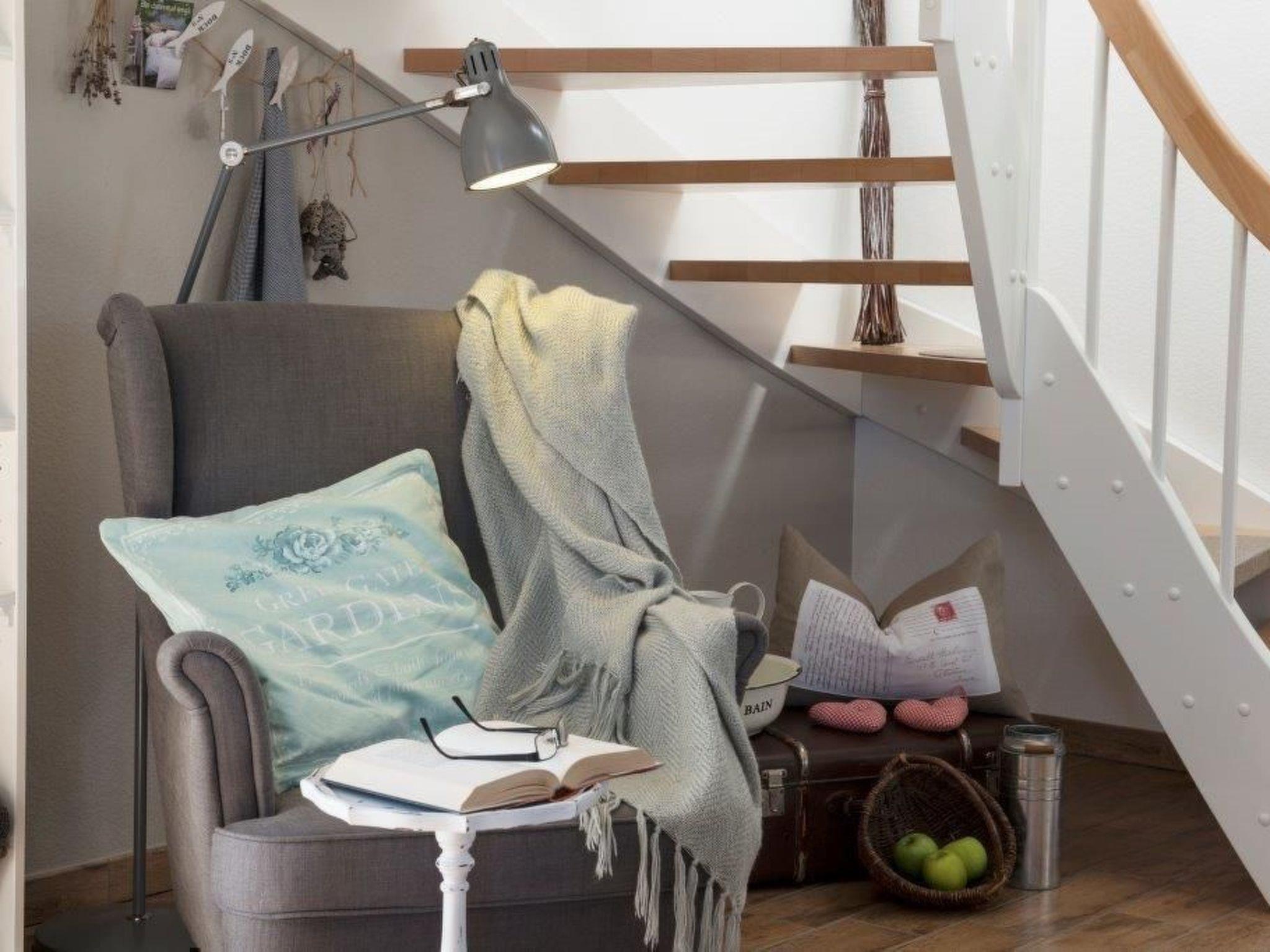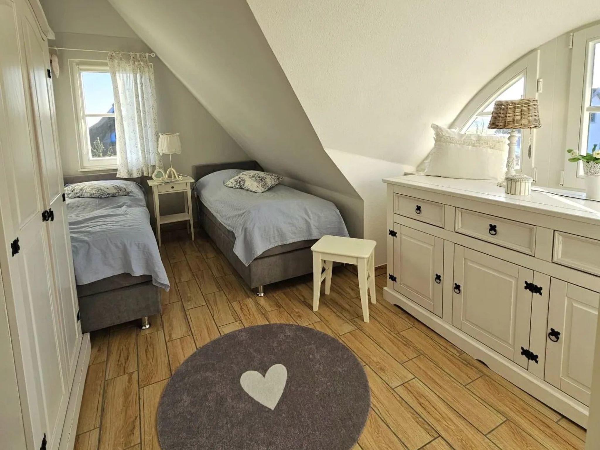 The antiallergenic and family-friendly house with a vintage-style interior provides 106m² of living space on a site of 664m². It has three bedrooms with six beds, providing plenty of space for families or couples holidaying together. Two bathrooms ensure that there are no queues in the morning. The ground floor has a cosy living and dining room with a comfy sofa, a fireplace stove with armchairs, a big flatscreen TV and a dining table with a bench and chairs for up to six people. The separate, fully-equipped country kitchen provides everything you need for cooking, as well as another cosy little seating area for two people. The three bedrooms are furnished with two double beds (160 x 200cm) and two single beds (80 x 200cm), which can also be joined together, along with a safe, a TV and full-length mirror. All the bedrooms have ample storage space for your clothing. The ground-floor bathroom has a sauna, shower, washbasin and WC, while the upstairs bathroom is fitted with a bath, shower, washbasin and WC. The house has tiled floors, under-floor heating and fly screens in the windows in the bedrooms and bathrooms.