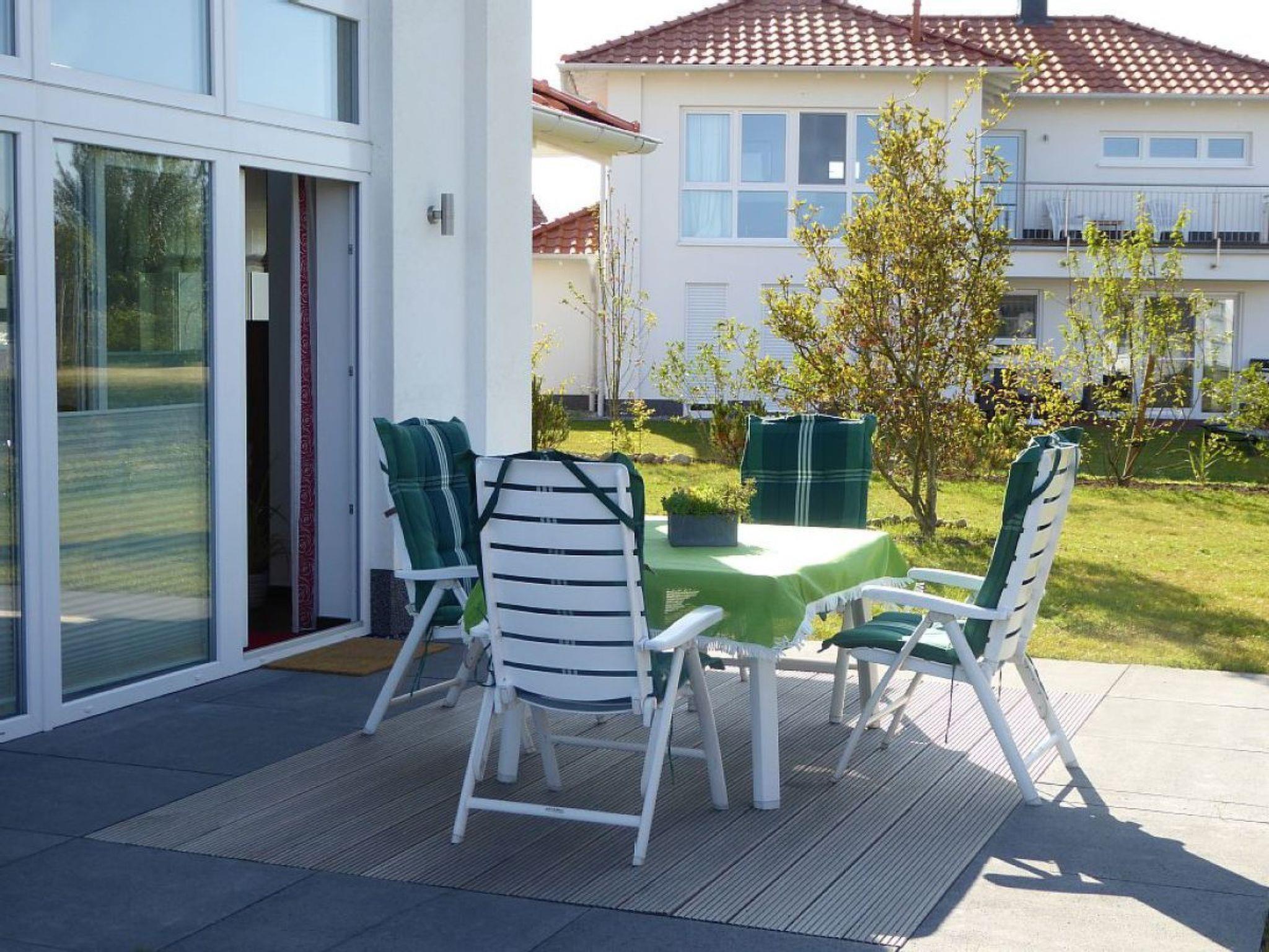 The outdoor area with two terraces provides garden furniture, two loungers, a bench and a charcoal grill. There is an outdoor sauna in the garden. The balcony on the upper floor, also with a view towards the island Hiddensee, has seating.