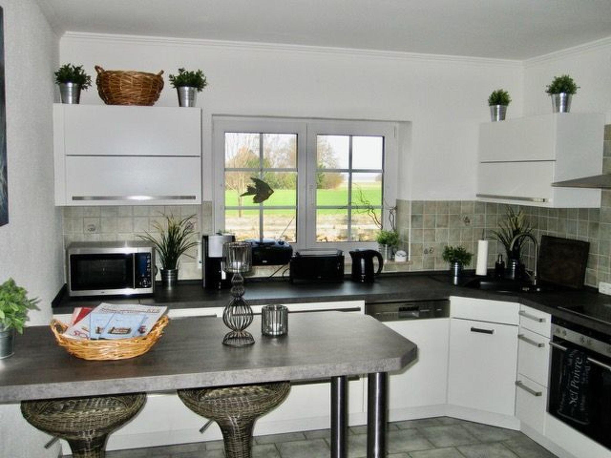 Kitchen equipped with: Bar counter with Bodden view, induction cooker, oven, microwave, fridge with freezer compartments, coffee machine, teapot, thermos flask, blender, hand mixer, kettle, etc.