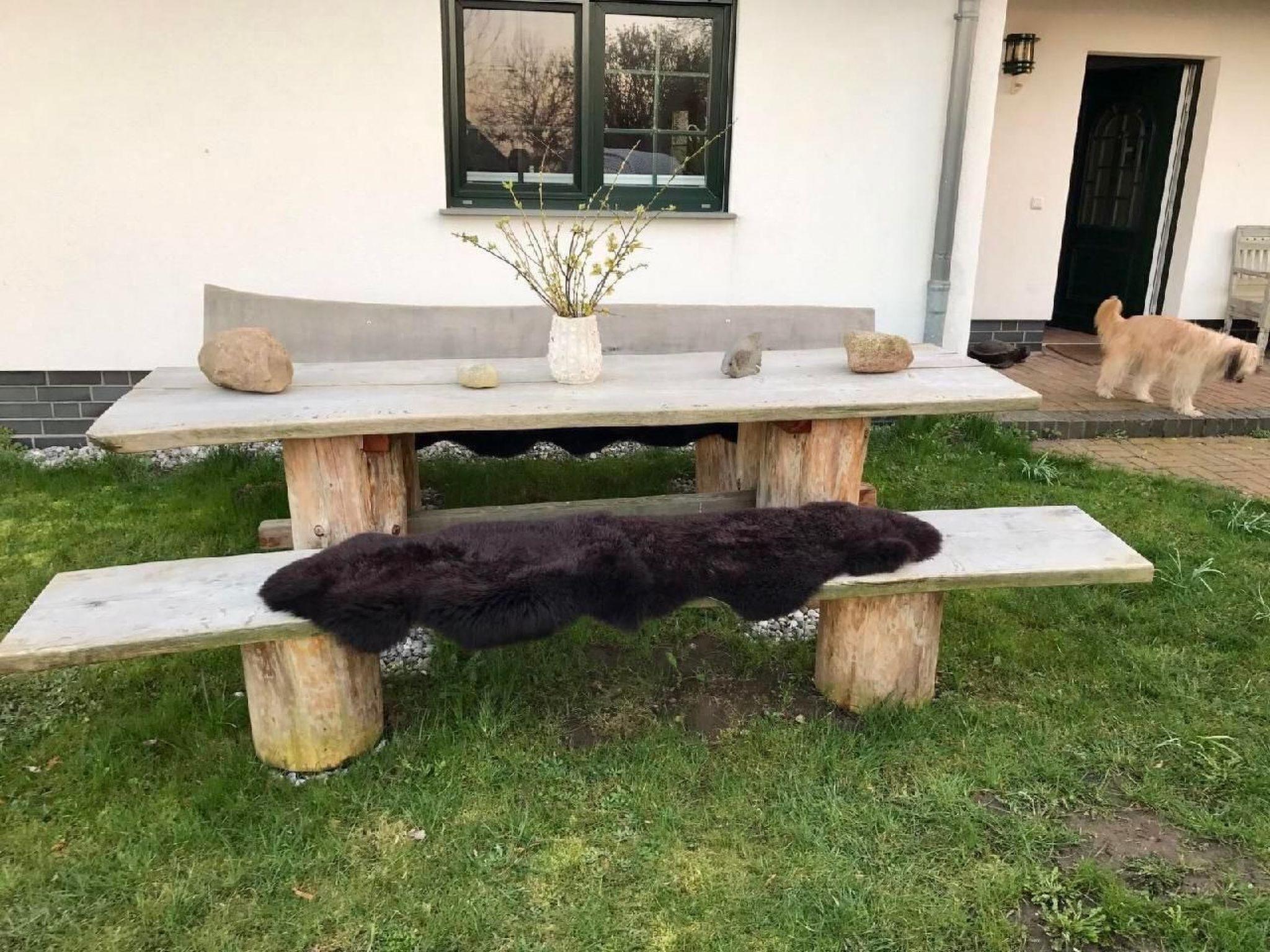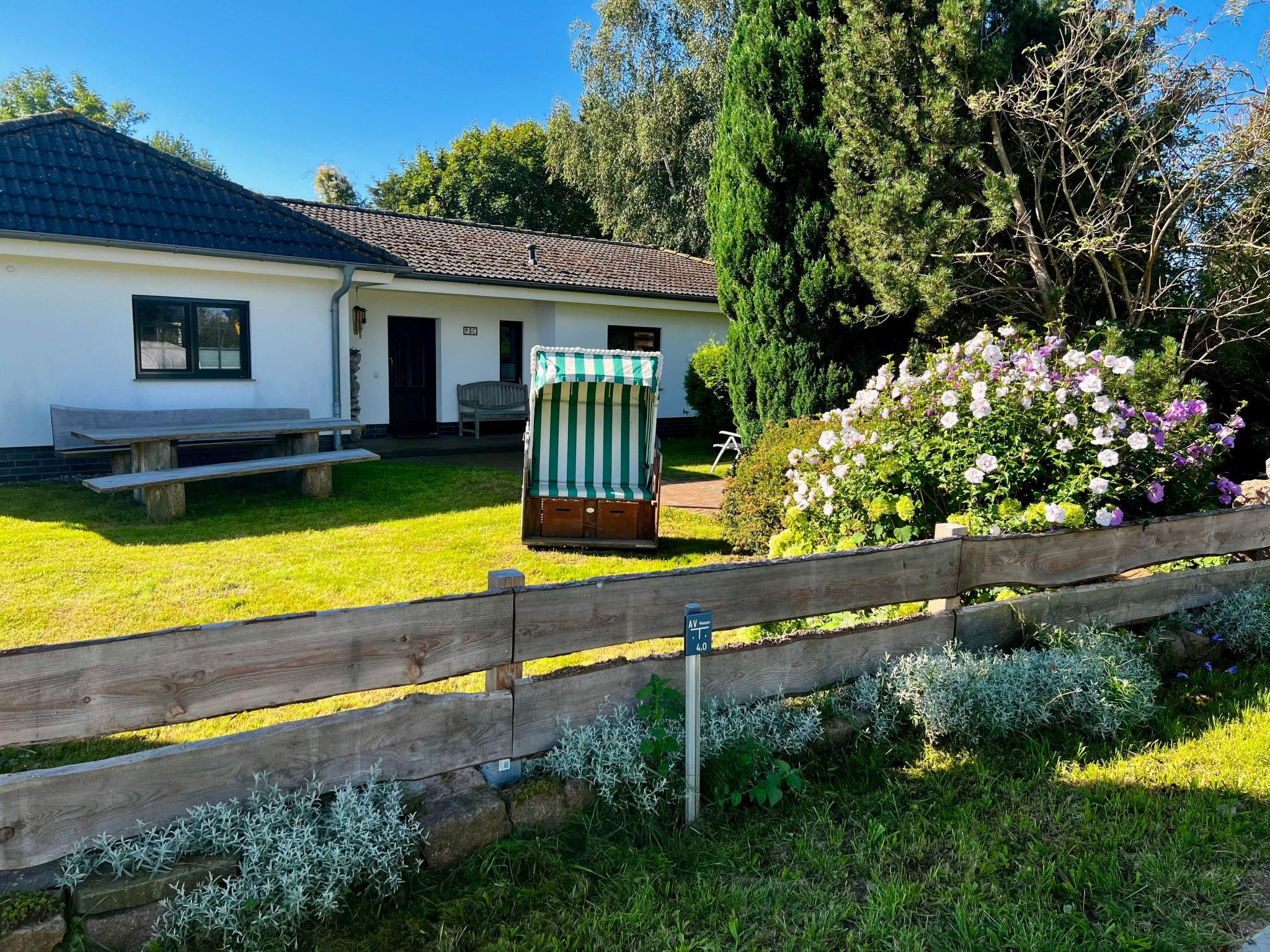 Original large fenced garden; several cosy seating areas in front of and behind the house, terrace behind the house is partly covered and sheltered from the wind, parasol, beach chair in the front garden with a wonderful view of the Bodden, charcoal grill + electric grill available.