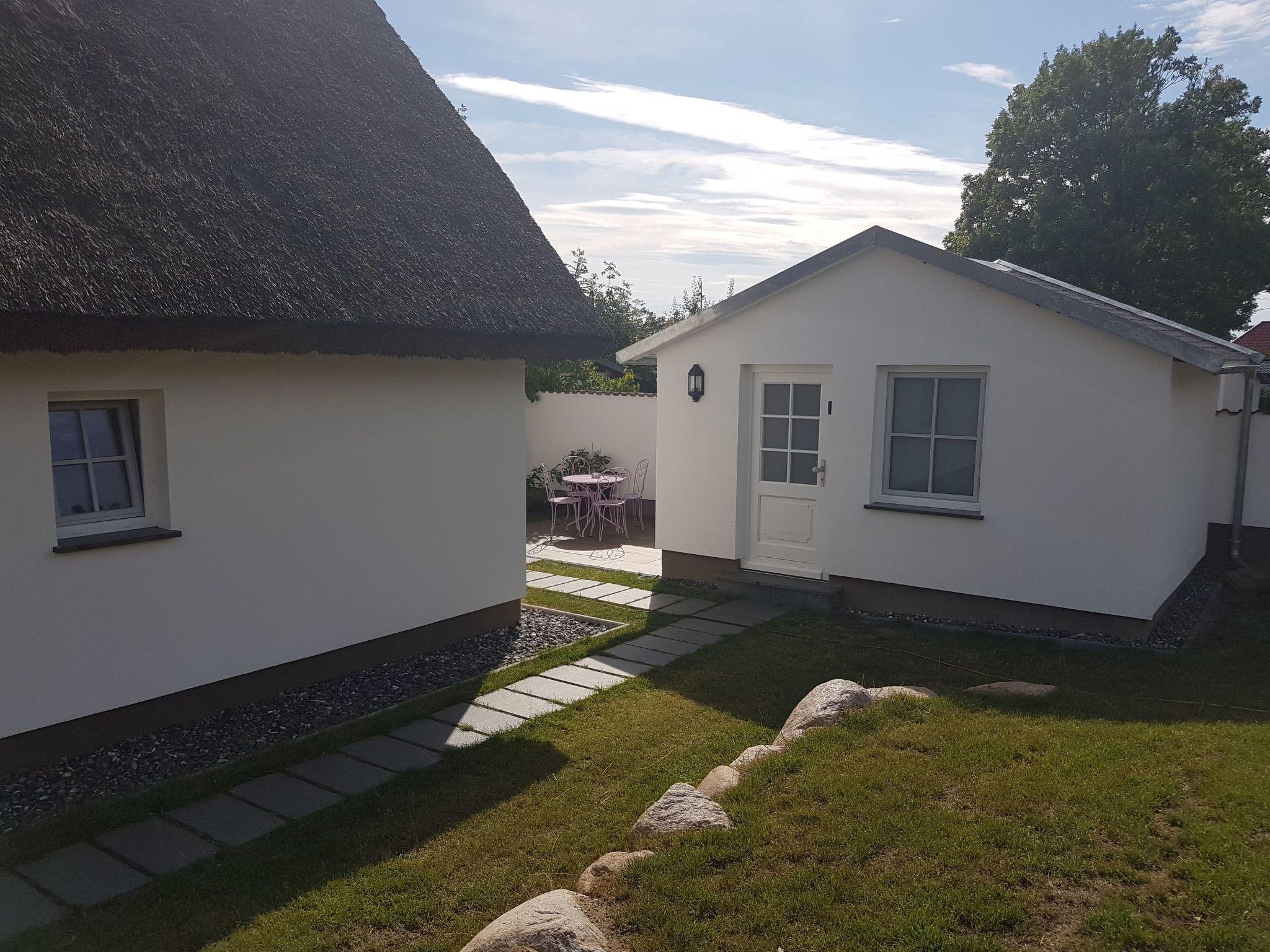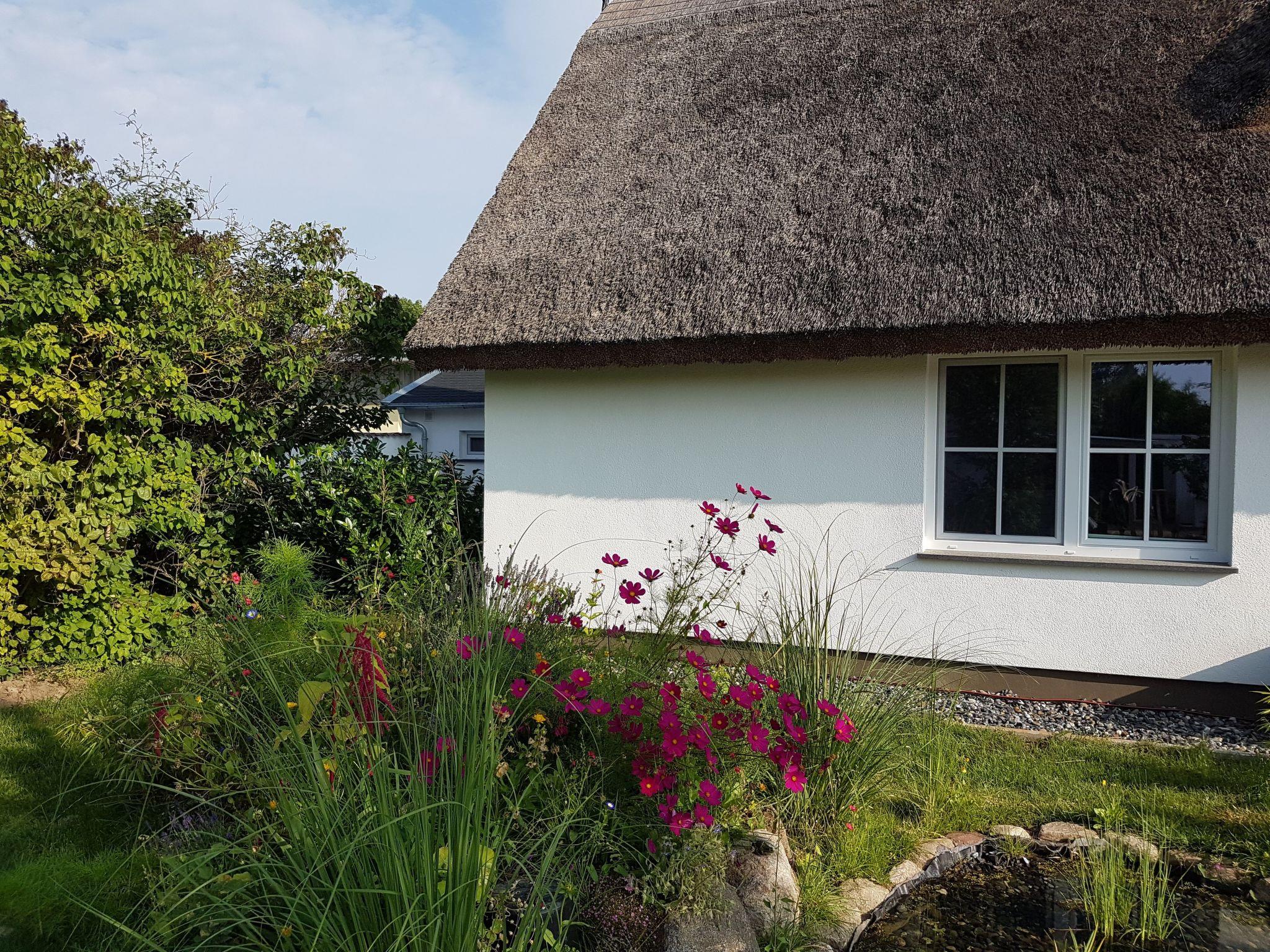 This 40m² thatched apartment was renovated in 2017. The house has a total of two separate holiday apartments, which can be combined for a group holiday for more than 6 people. This holiday apartment has a bathroom, a bedroom, underfloor heating, a fully-equipped kitchen and direct access to the garden and the terrace. The living room provides a dining table for 4-6 people, a double sofa bed (160 x 200cm), a bedroom with a double bed (140 x 200cm). The bathroom has a shower. The kitchen is equipped with an induction hob, dishwasher, freezer, small appliances and full inventory. A 55” satellite TV, Wi-Fi Internet access and underfloor heating are available, as well as dishwasher tabs, rubbish bags, tea towels, toilet paper, kitchen roll, washing up liquid and hand soap. Laundry packages (towels and bed linen) can be booked optionally in addition. There is a room with a washing machine and dryer.