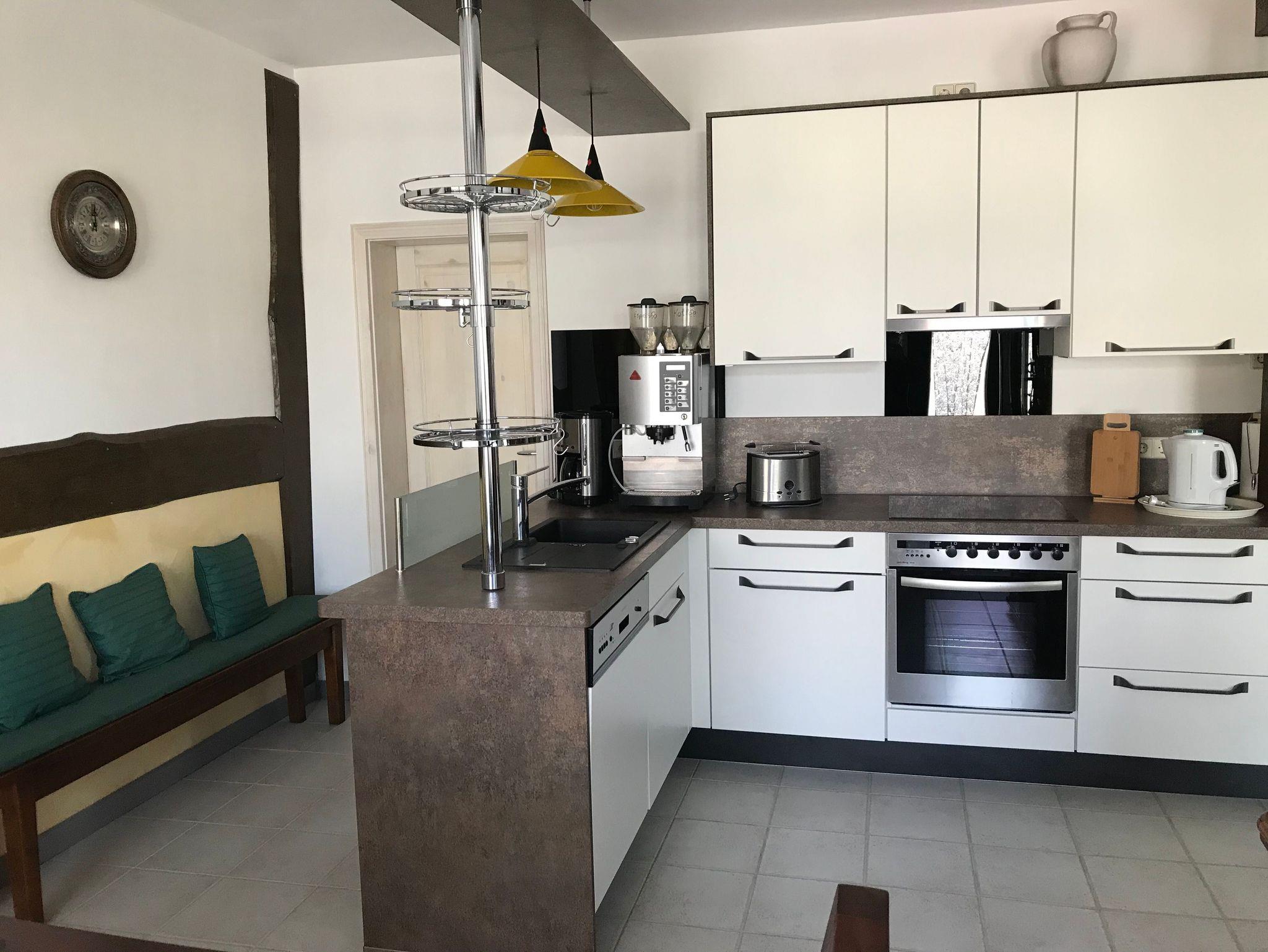 Der Küchenbereich innerhalb dieser offenen Raumgestaltung verfügt über eine großzügige Ausstattung an Küchenutensilien, so auch die technischen Gerätschaften, wie z.B. Herd mit Backofen, Kühl-Gefrierkombination und Spülmaschine. Angeschlossen ist der Eßtisch mit großem Schaufensterblick. Die Außensitzgruppe ist hier sichtbar.