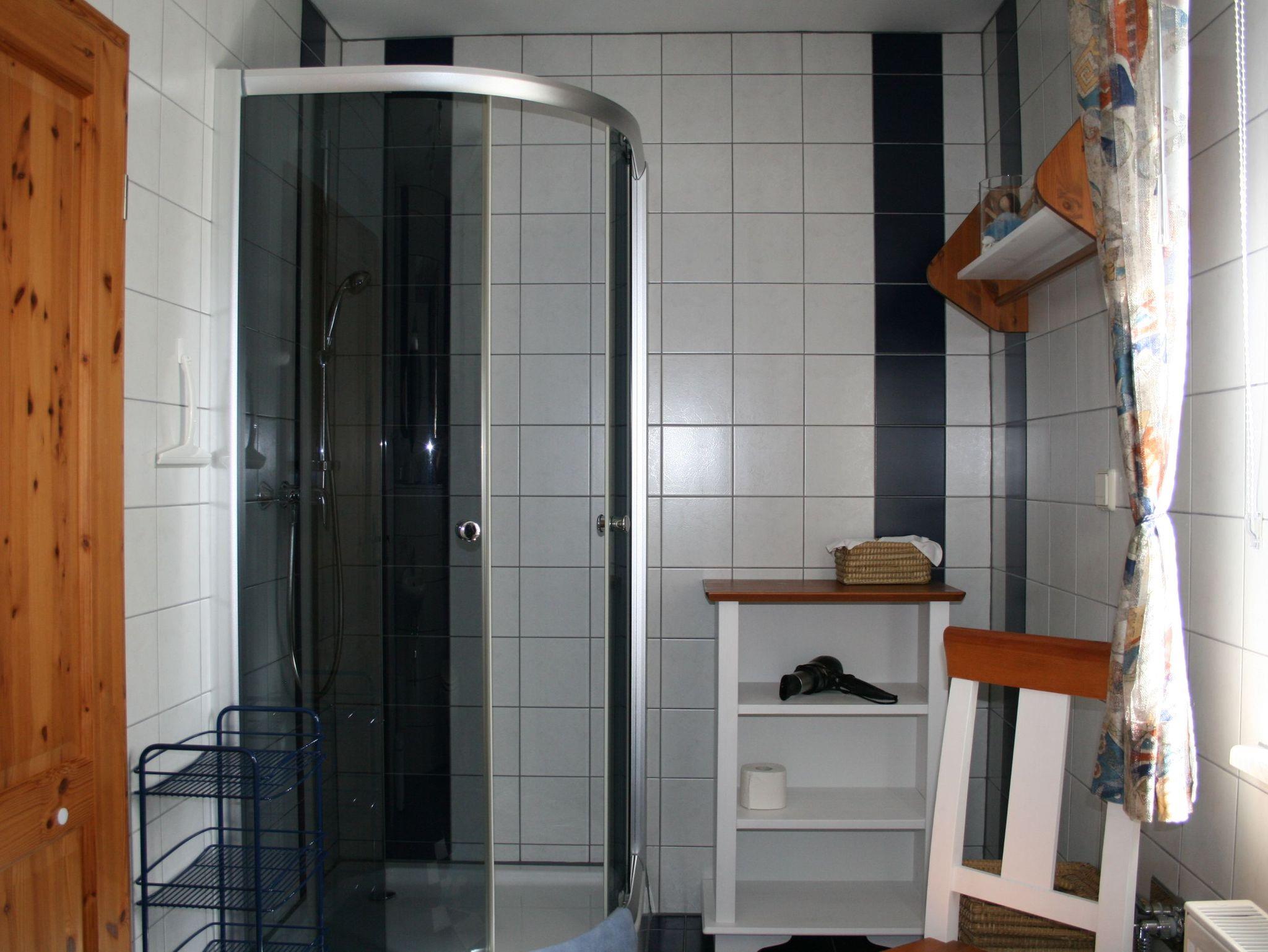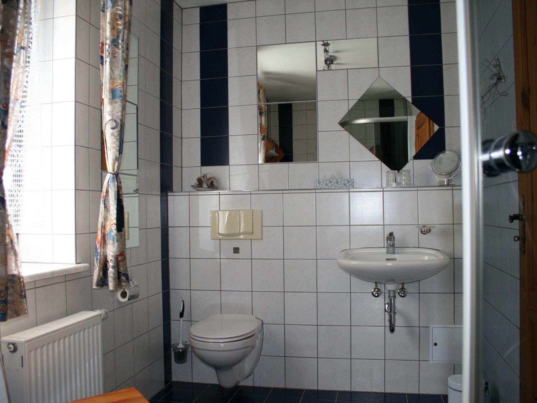 Das Bad, daß mit der üblichen Sanitäreinrichtung aufwartet, hat zur weiteren Körperreinigung einen Duschbereich. Dort befinden sich bei gewählter Zusatzleistung Handtücher, Waschlappen, Duschvorleger und Badehandtücher.