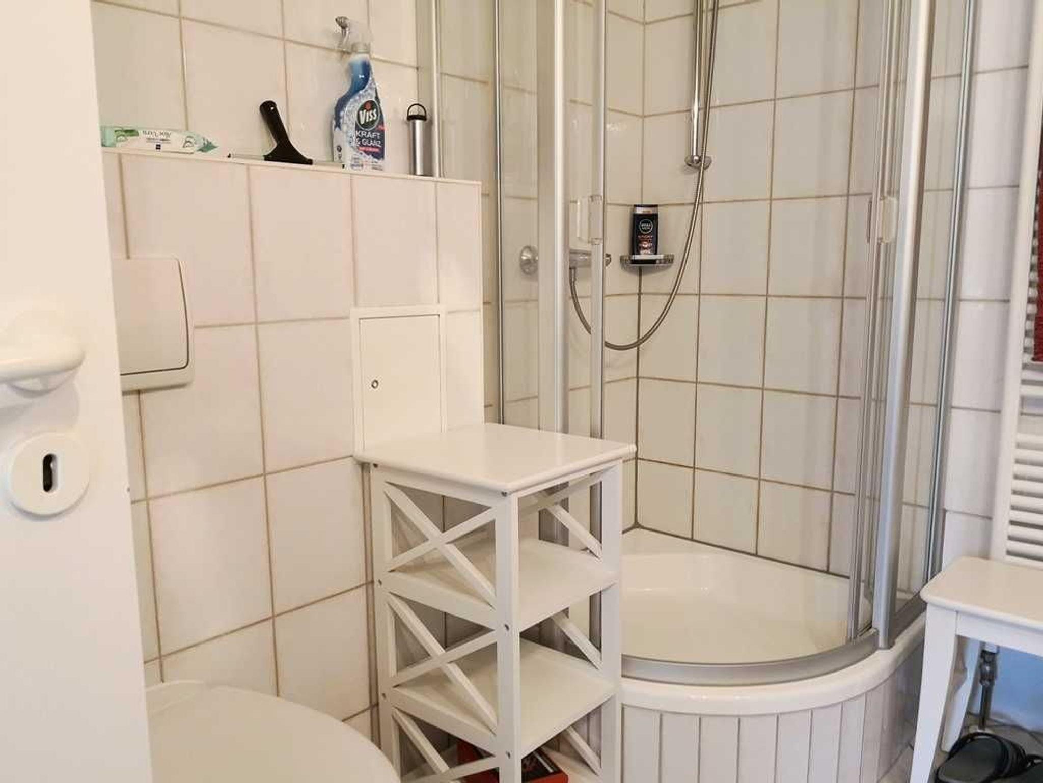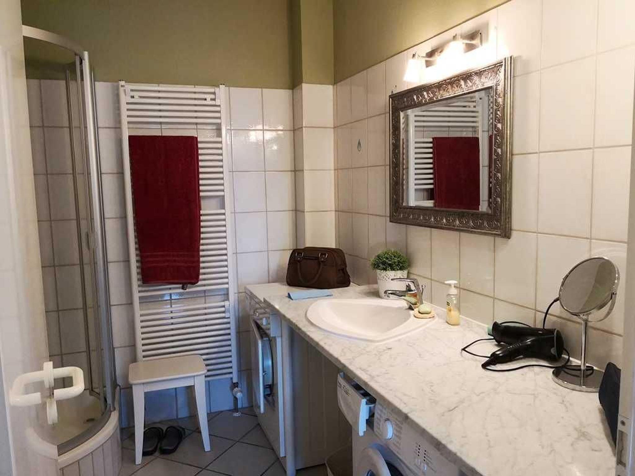 Badezimmer Waschbecken, WC, Dusche, Föhn, Waschmaschine, Trockner.
