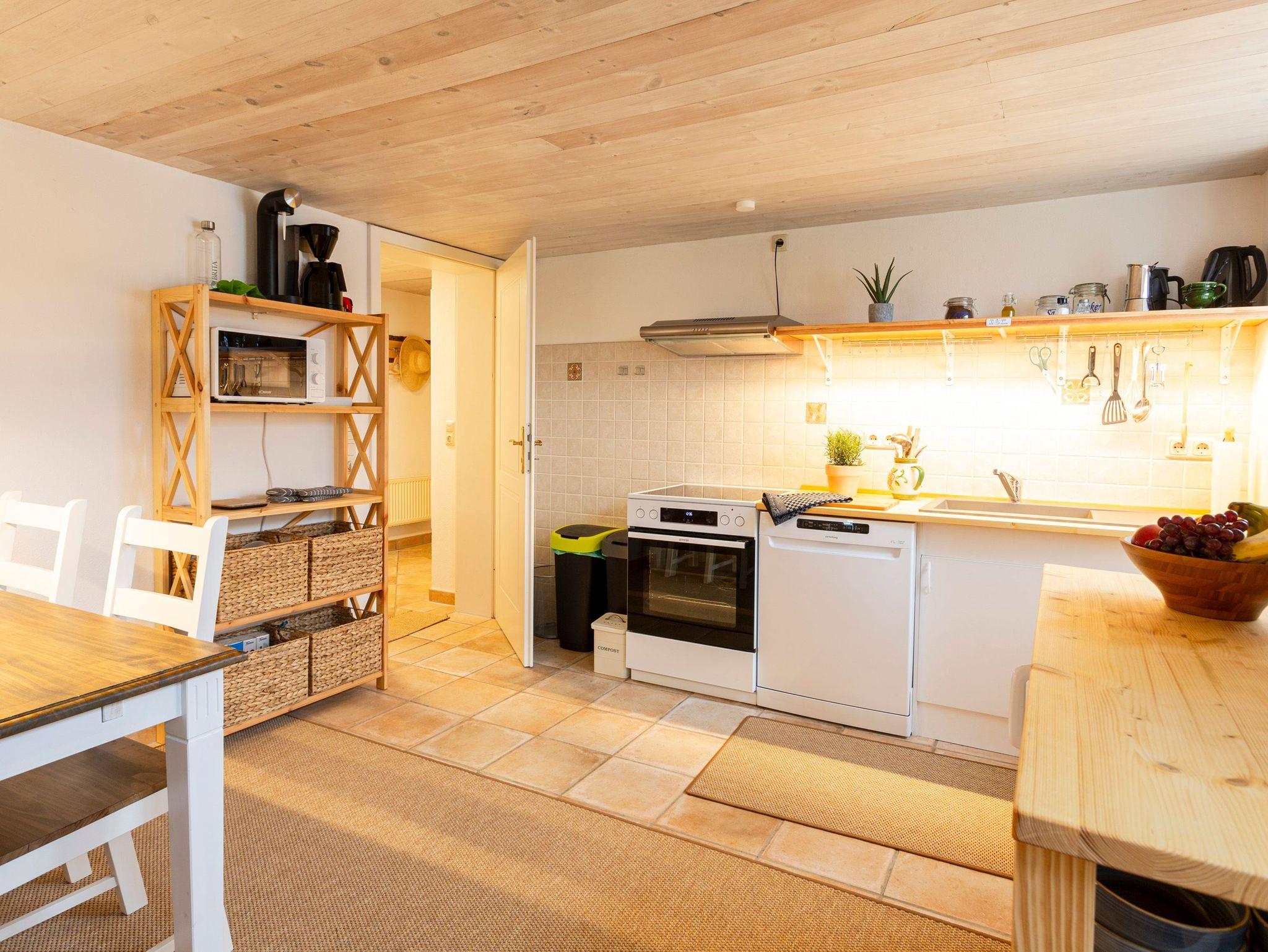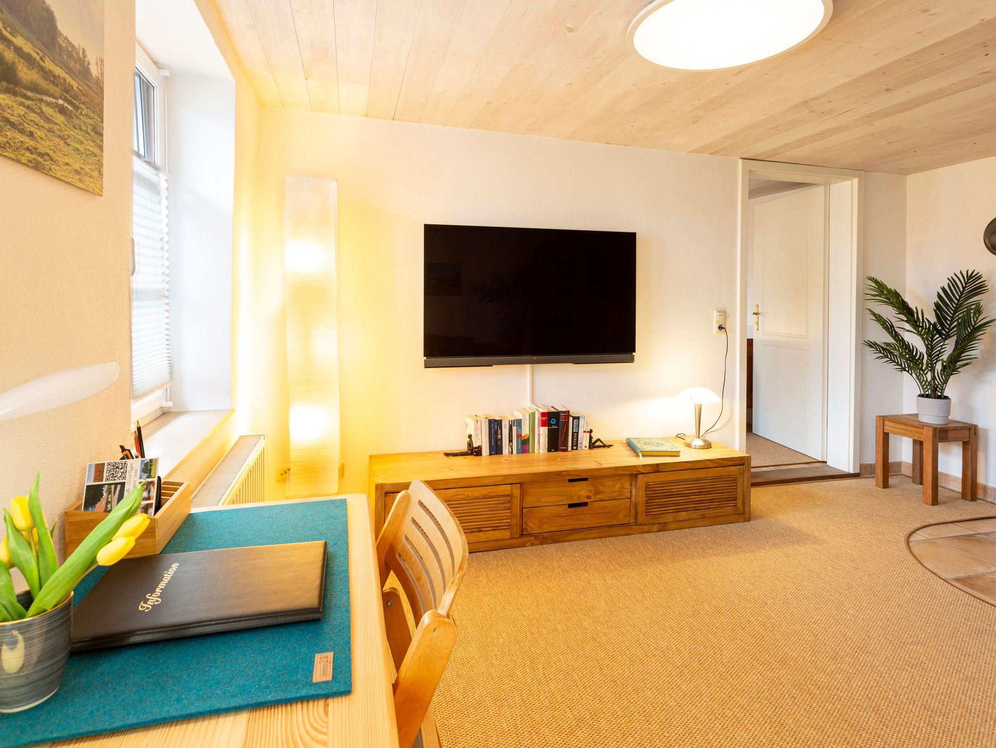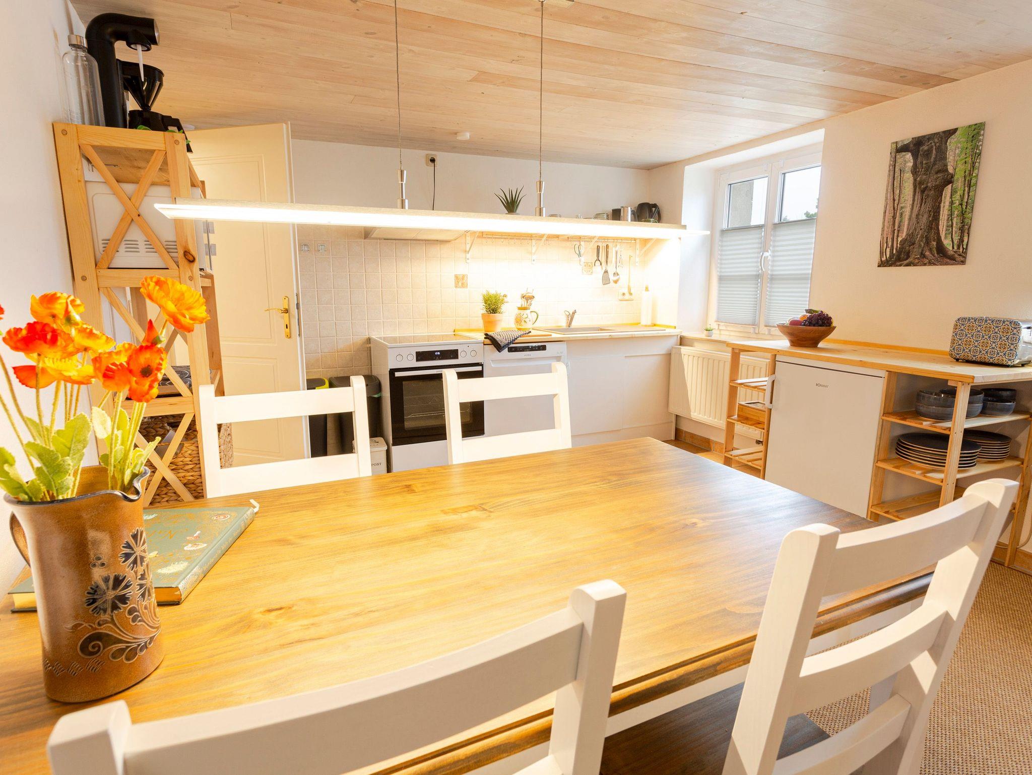 Die Ferienwohnung 3 im Haus Klein Kapelle befindet sich im Erdgeschoss des Hauses und bietet auf 57 m² genügend Platz für bis zu 4 Personen und einem Baby. Das Wohnzimmer verfügt neben einem Schlafsofa (150x210) und einem großen TV über einen modernen Kamin, der angenehme Wärme an kalten Abenden spendet. Das Schlafzimmer schließt sich an das Wohnzimmer und bietet ein Doppelbett (160x200) und ein Einzelbett (70x175) für erholsame Nächte. Die geräumige Küche lädt zum Kochen und gemeinsamen Genießen ein. Im Zentrum steht der große Esstisch und rund herum befindet sich die voll ausgestattete Küche im Landhausstil. Kochen sie ganz wie zu Hause, dafür stehen ihnen Herd, Backofen, Kühlschrank, Geschirrspüler und Mikrowelle zur Verfügung. Die kleinen Küchenhelfer des Alltags, wie Kaffeemaschine, Toaster, Wasserkocher und Milchaufschäumer befinden sich ebenfalls in der Küche. Das Bad ist mit einer Badewanne, WC, Waschbecken und einer Waschmaschine ausgestattet.