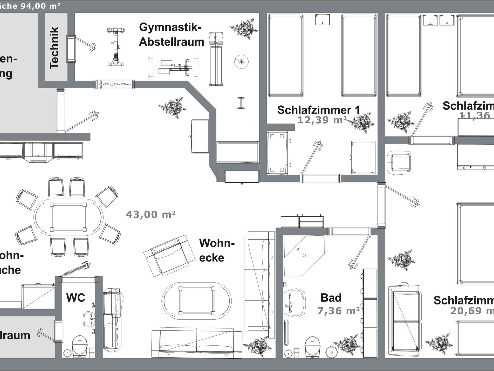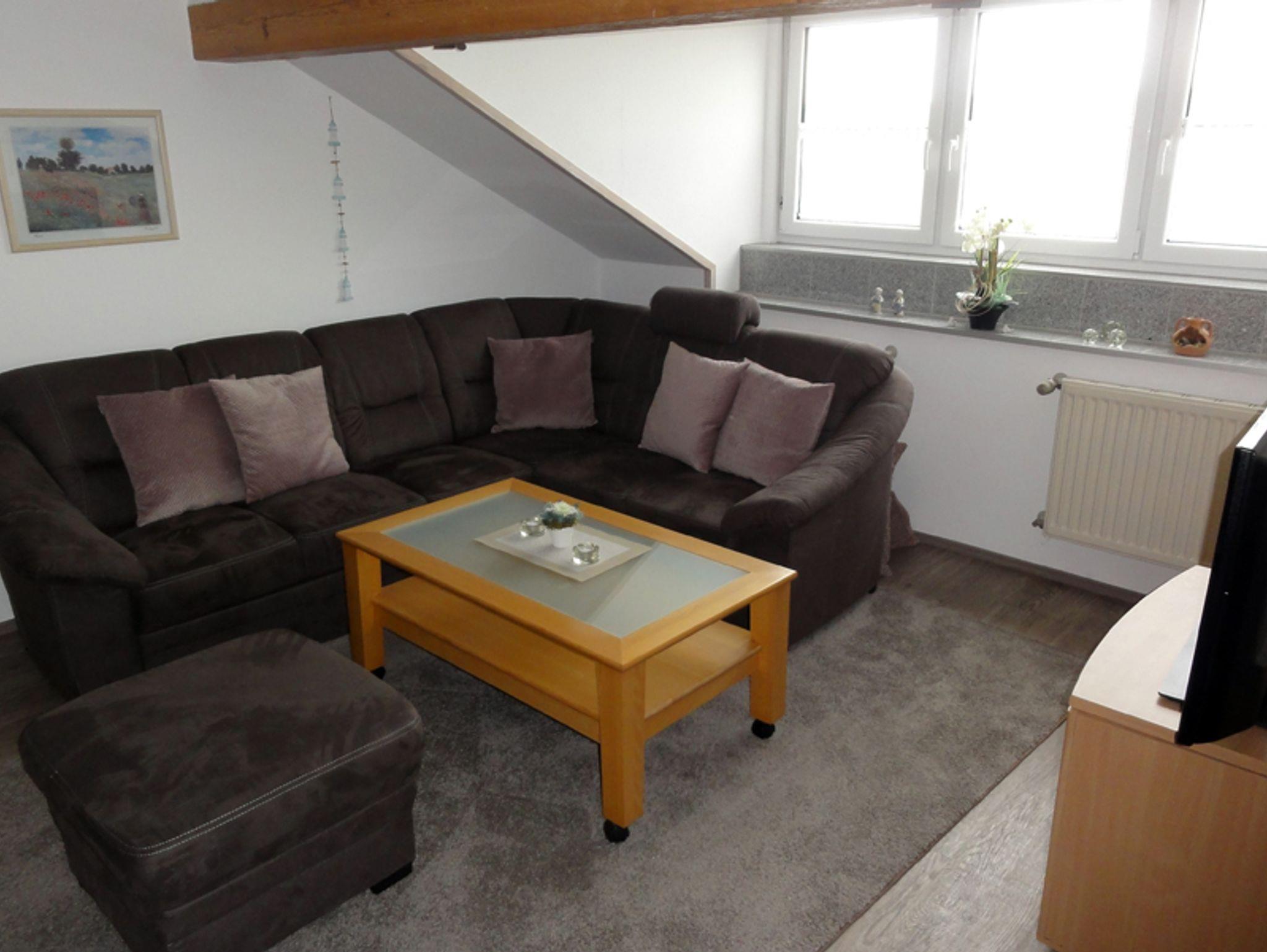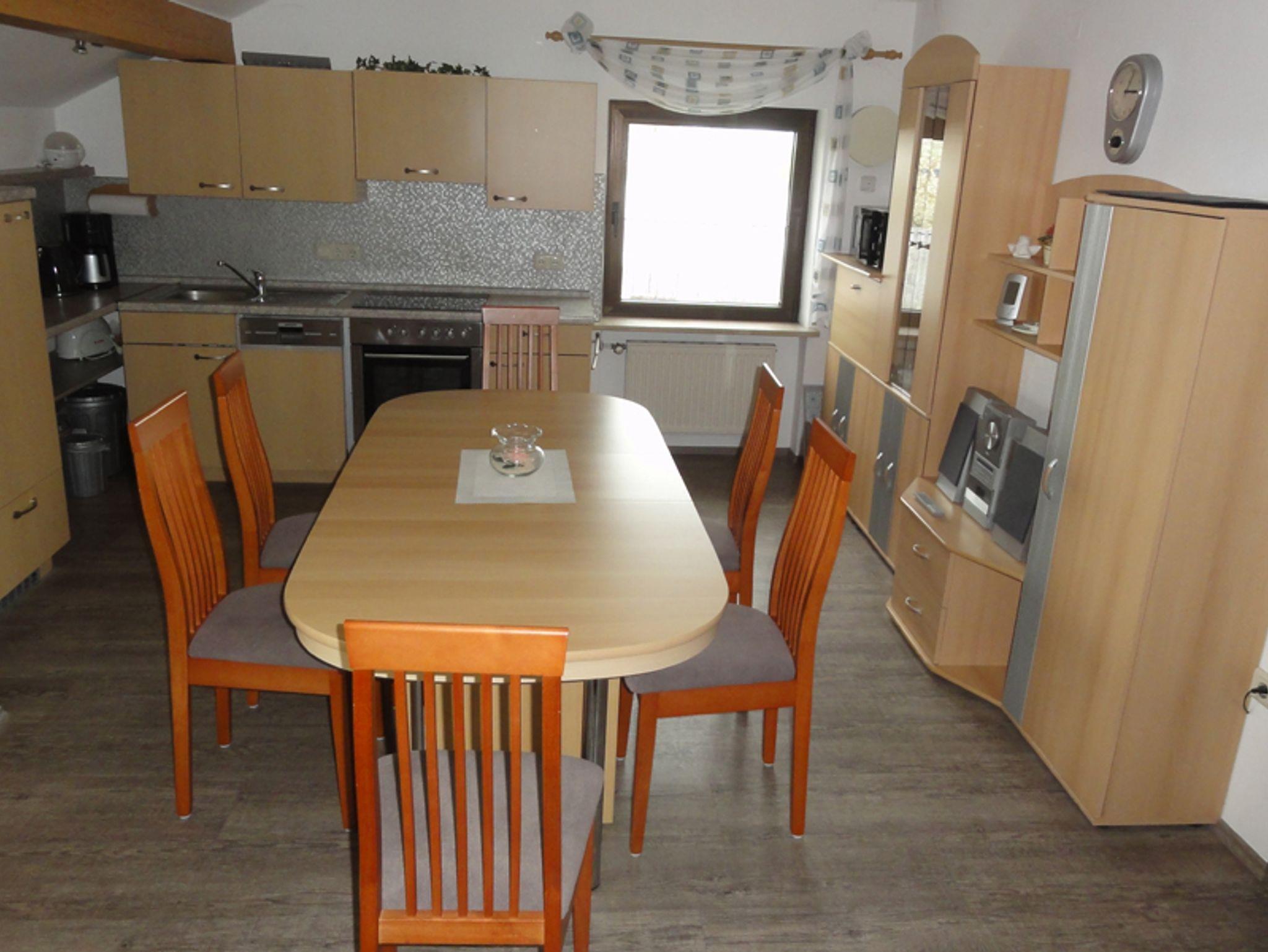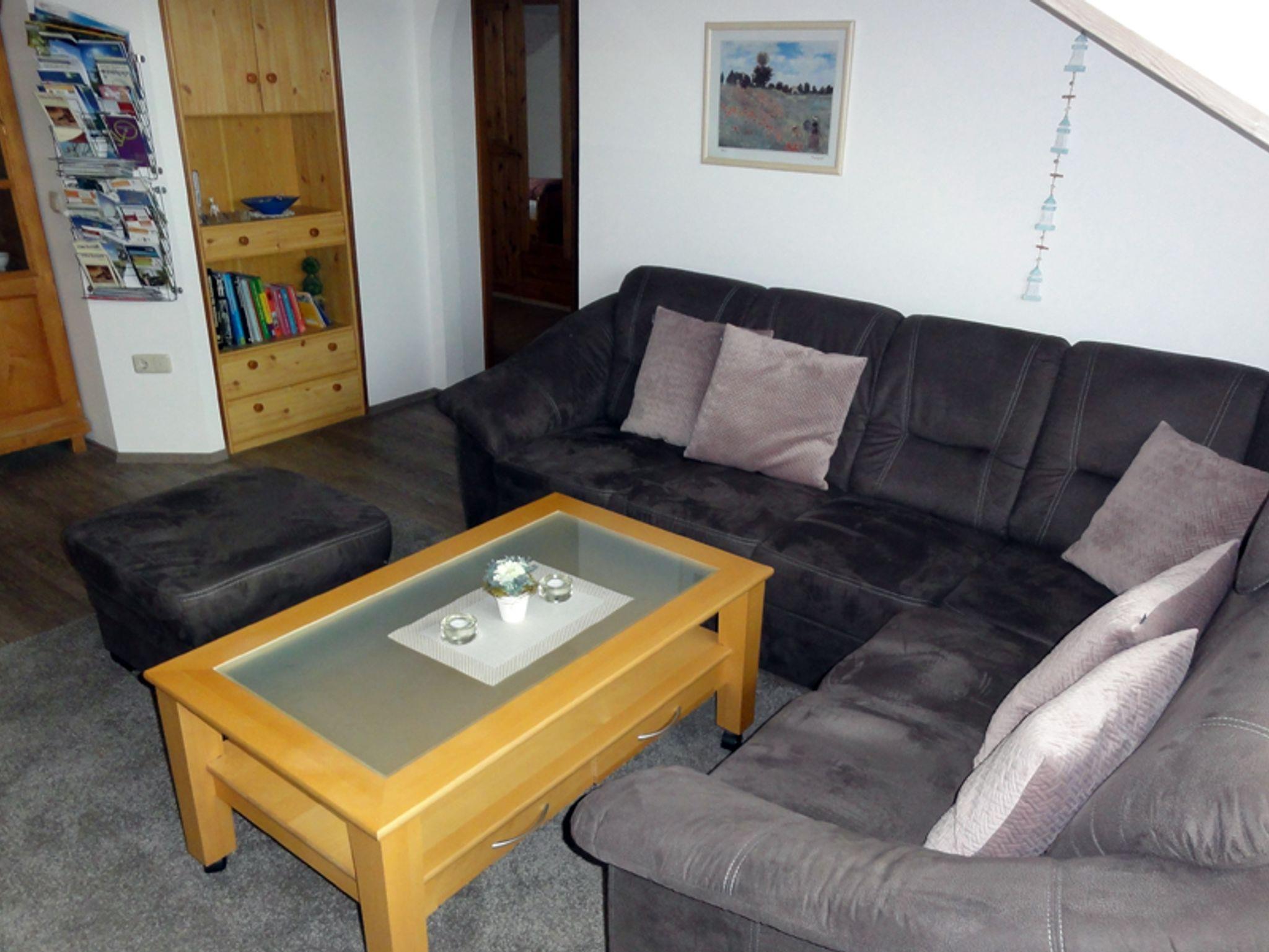 Ferienwohnung mit ca. 94 m2, Dachgeschoßwohnung mit Dachgauben, Wohnraumbelüftung mit Wärmerückgewinnung, Küche, Wohn-Esszimmer, 3 Schlafzimmer, Bad (Dusche, WC), seperates WC, Gymnastik- u. Abstellraum. Küche ist mit Backofen mit Cerankochfeld, Mikrowelle, Kühlschrank mit Gefrierfach, Geschirrspüler, Kaffeemaschine, Toaster, Brotschneidemaschine, Wasserkocher, Eierkocher, sämtliches Geschirr und Besteck, Töpfe und Pfannen ausgestattet. Im Wohn-Essbereich finden Sie zwei Ledersofas mit Lederstuhl und Wohnzimmertisch, WLAN, SAT-TV, DVD-Recorder, CD-Radio, Spiele für Kinder, Esszimmertisch mit 8 Stühlen, Kinderhochstuhl. Die drei Schlafzimmer teilen sich wie folt auf: 2 Zimmer mit jeweils einem Doppelbett u. einem Bett, 1 Zimmer mit zwei Betten, ein Schlafsofa und ein Kinderreisebett, Betten mit Federkernmatratze, Nachttisch mit Leselampe, Kleiderschrank in jedem Zimmer.