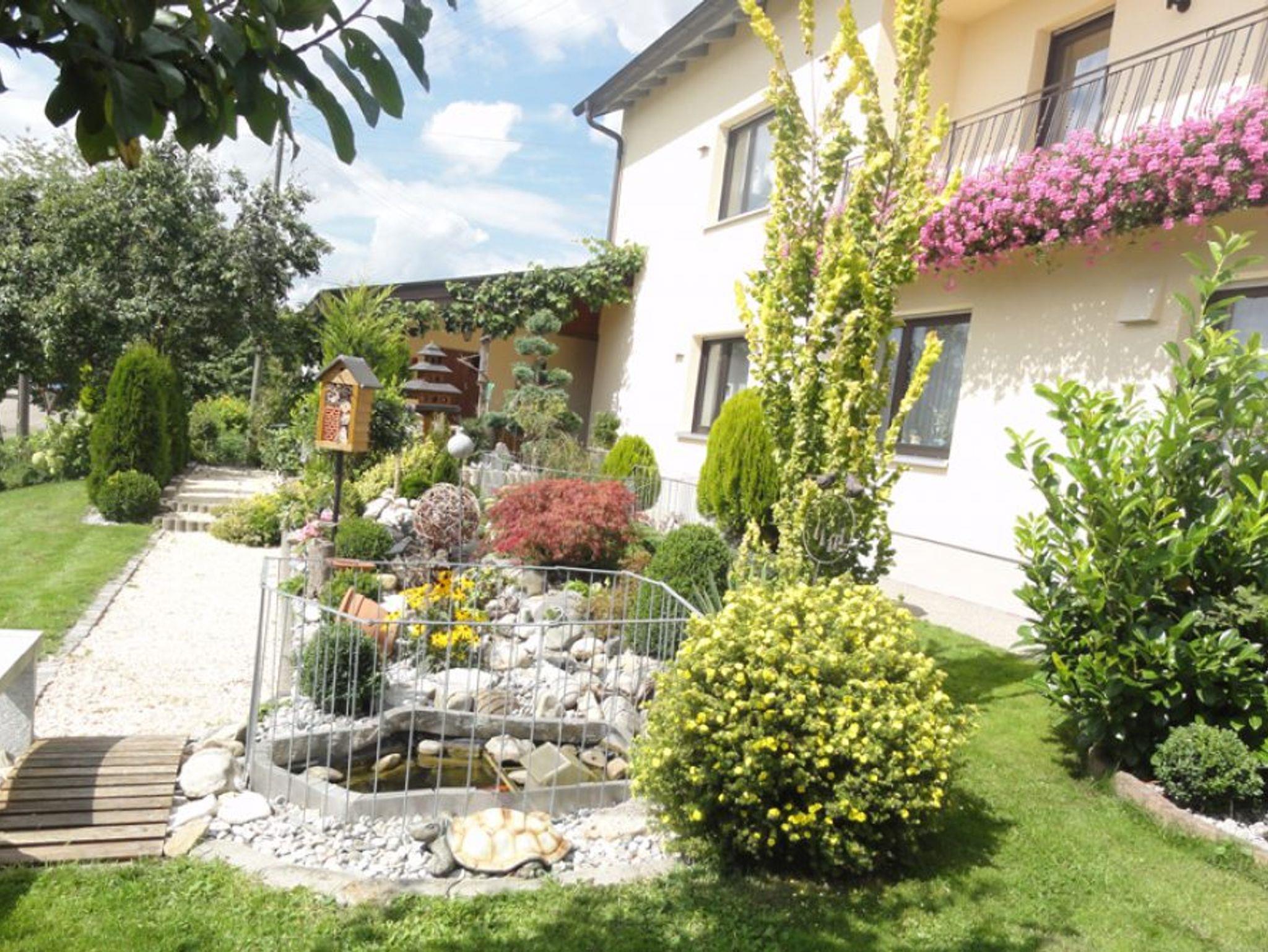 In unserem Garten können Sie sich wie zu Hause fühlen. Es gibt eine Liegewiese, eine Teichanlage mit Bachlauf, ein Kneippbecken, einen Sandkasten für Kinder, mehrere Sitzplätze mit Grillbenutzung und einen Fahrradschuppen.