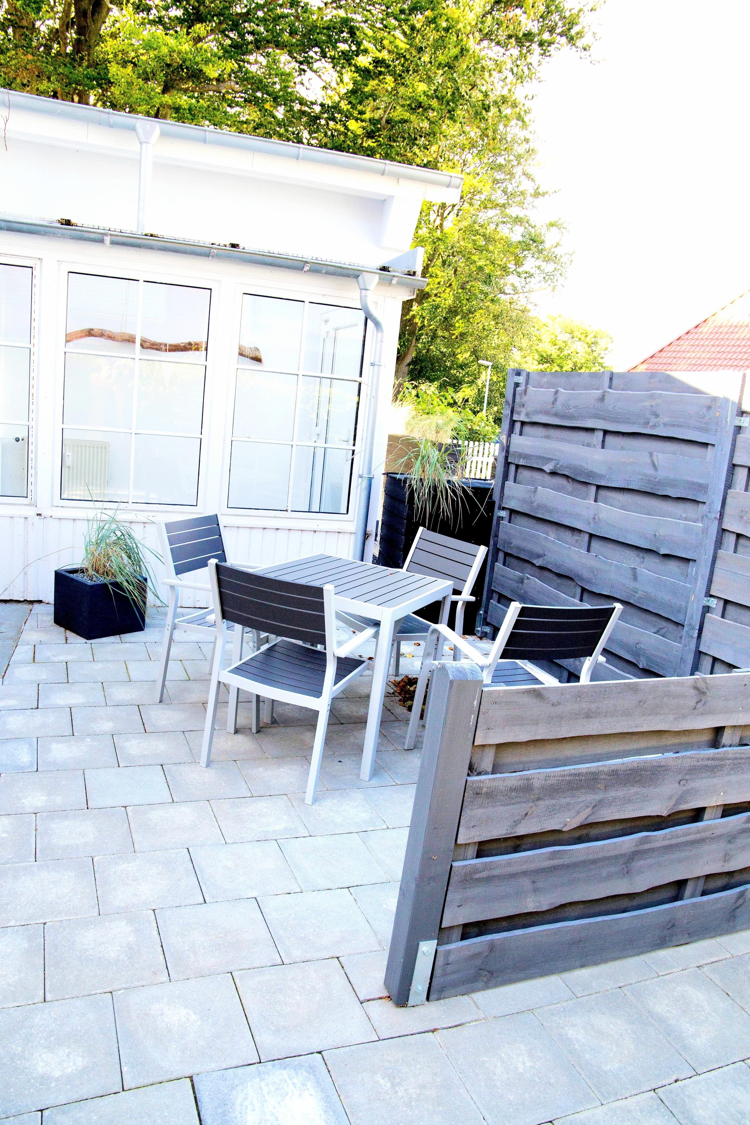 Die teilweise überdachte Terrasse liegt nur wenige Schritte vor dem Eingang und bietet Gartenmöbel, einen Grill und einen Strandkorb. Die offene Küche ist vollständig ausgestattet und integriert sich harmonisch in den Wohnbereich mit Flat TV und Bluray Player sowie einer gemütlichen Schlafcouch.