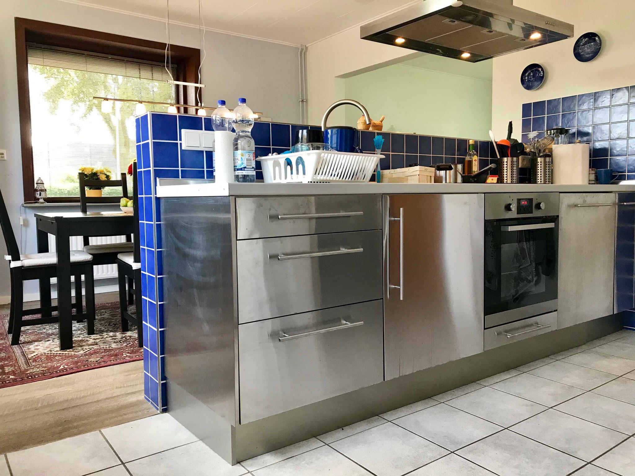• offene Küche (Ceran-Kochfeld und Backofen mit Grillfunktion, Dunstabzug, Mikrowelle, Spülmaschine, großer Kühlschrank mit Gefrierfach, Kaffeemaschine, Toaster und Standmixer)