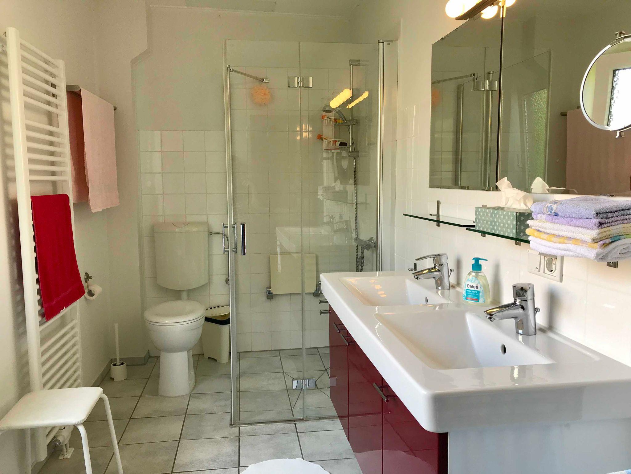 • Senioren-freundliches Badezimmer mit barrierefreier Dusche, Doppelwaschtisch und Senioren-WC, Waschmaschine, Fön