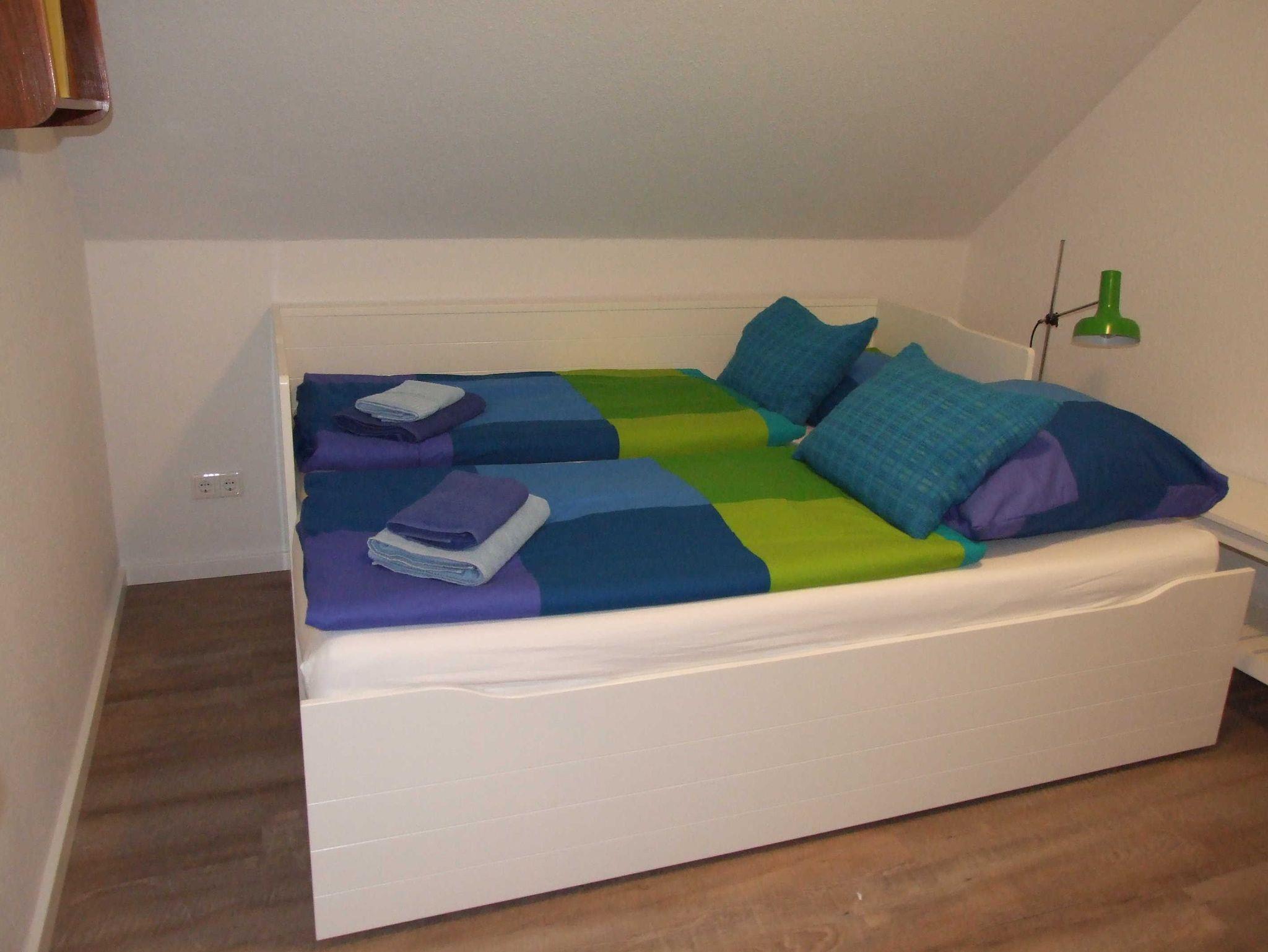 • 1 kleines Schlafzimmer mit großem Kleiderschrank, Einzelbett mit herausziehbarem separaten Unterbett