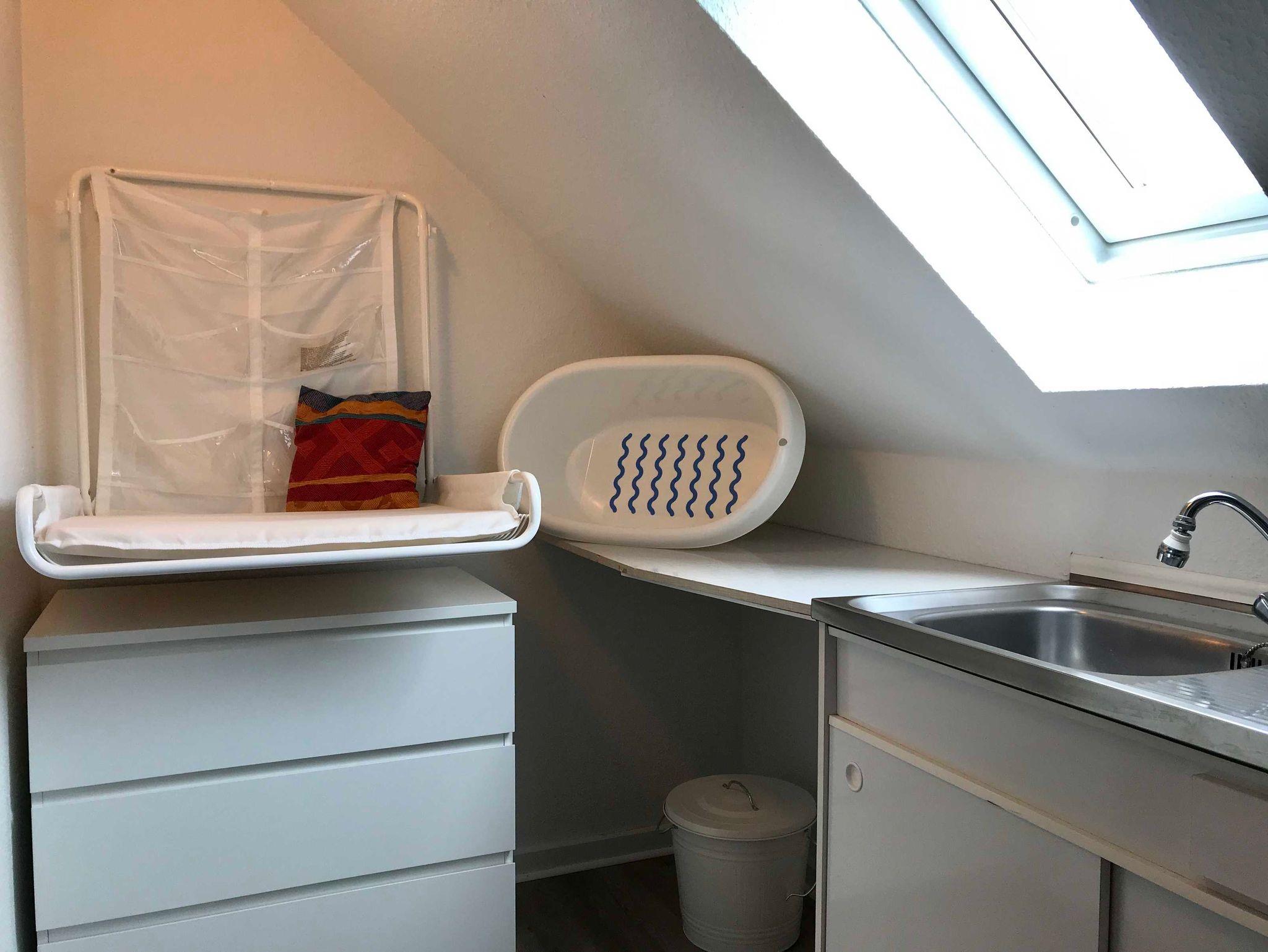 • Abseite mit Kommode, Wickelaufsatz und Waschbecken, Putzzeug, Bügelbrett und Bügeleisen, eingebautem Regal, auch als Kofferkammer zu nutzen