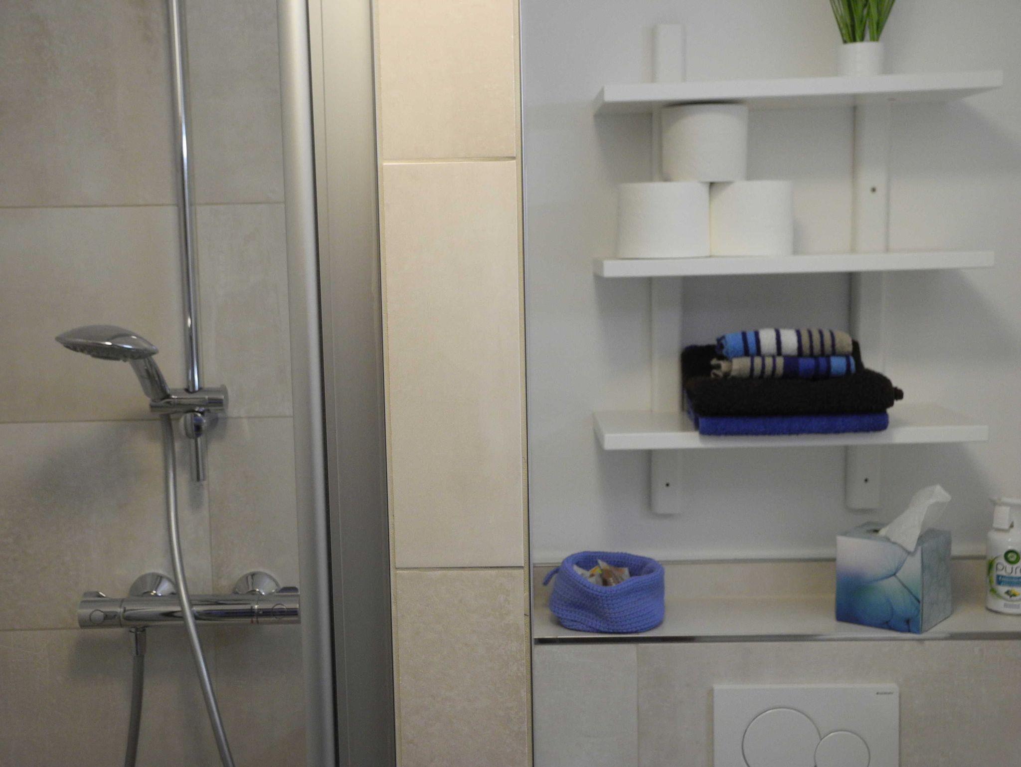 • Bad mit Dusche, WC, Waschbecken und verschiedenen Ablagen