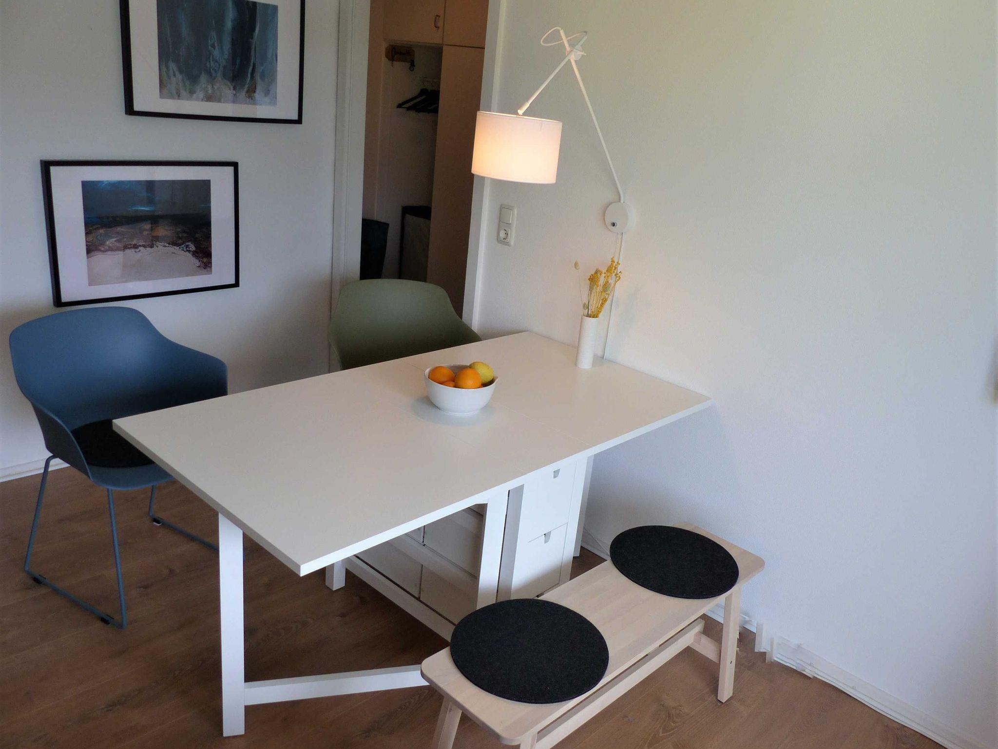 Auf 35qm finden Sie ein komfortables 1,60m breites Bett in einem attraktiven Schlafzimmer. Kommoden und Einbauschränke in Schlafzimmer und Flur bieten sehr viel Stauraum für Kleidung und Vorräte. In dem Wohnraum finden Sie ein Tagesbett, dass als wunderbares Sofa genutzt wird und nach Bedarf in ein 1,60m breites komfortables Bett umgewandelt werden kann. Der Esstisch ist flexibel nutzbar und kann sowohl durch 2 Personen, als auch 4-6 Personen genutzt werden.Homeoffice möglich - Glasfaseranschluss vorhanden. Auf Anfrage halten wir gerne ein Babybett für Sie bereit (4,50€ Aufpreis pro Tag).