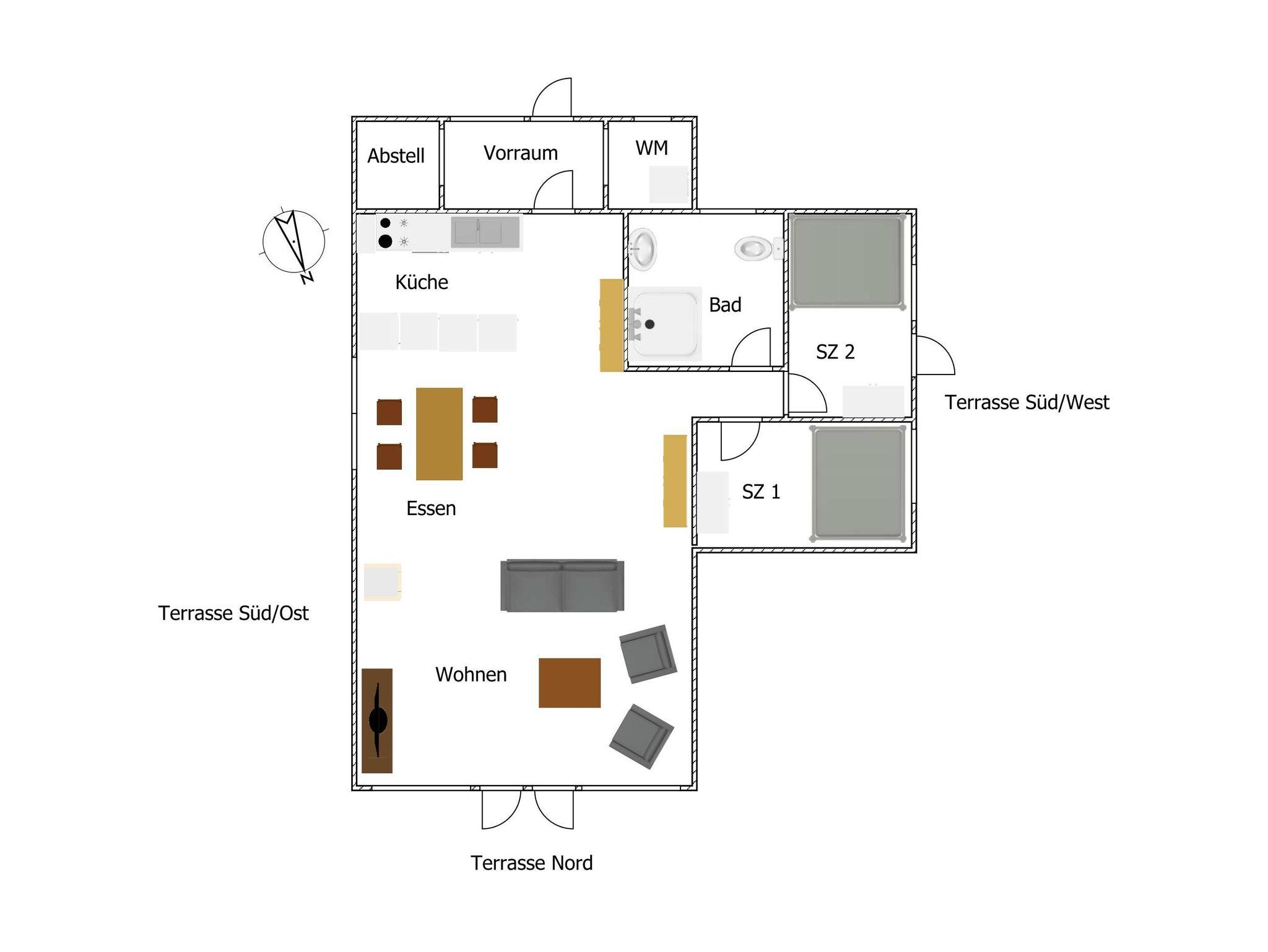 Die Gesamtgröße des Ferienhauses beträgt ca. 60 m². Es bietet Platz für 3- 4 Personen.