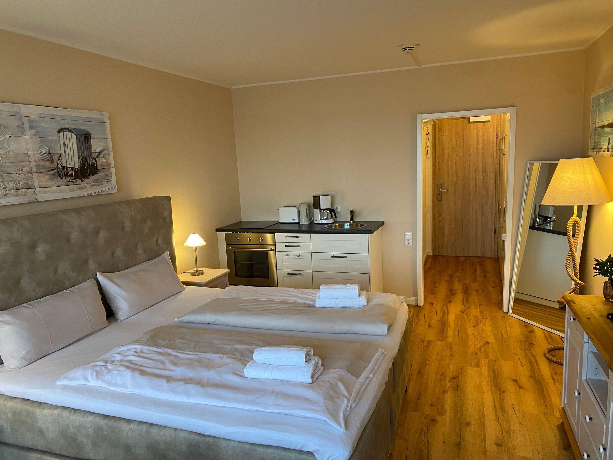 Genießen Sie Ihren Urlaub in dem liebevoll eingerichteten Studio-Apartment Anna mit Balkon und mit einem atemberaubenden Panoramablick auf die Flensburger Förde. Das Apartment wurde aufwändig renoviert und komfortabel ausgestattet. Es erwartet Sie eine kleine Küchenzeile. Das Apartment ist mit einem bequemen Boxspringbett, Einbauschränken und einem Duschbad ausgestattet. Auf den Parkdecks des Intermar- Gebäudes stehen kostenfrei nutzbare Parkplätze zur Verfügung. Eine feste Zuordnung oder eine Reservierung ist leider nicht möglich. Auch E-Bikes können dort sicher untergestellt werden. Ein Frühstück kann zwar nicht zum Apartment dazugebucht werden, jedoch befindet sich im Erdgeschoss des Gebäudes das Gudlak - mit Frühstücksmöglichkeit, Restaurant und Strandbar - in dem man Sie herzlich willkommen heißt.